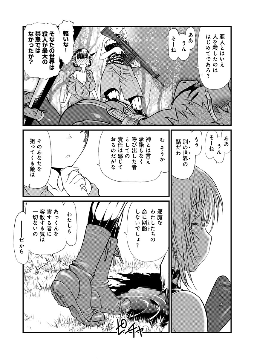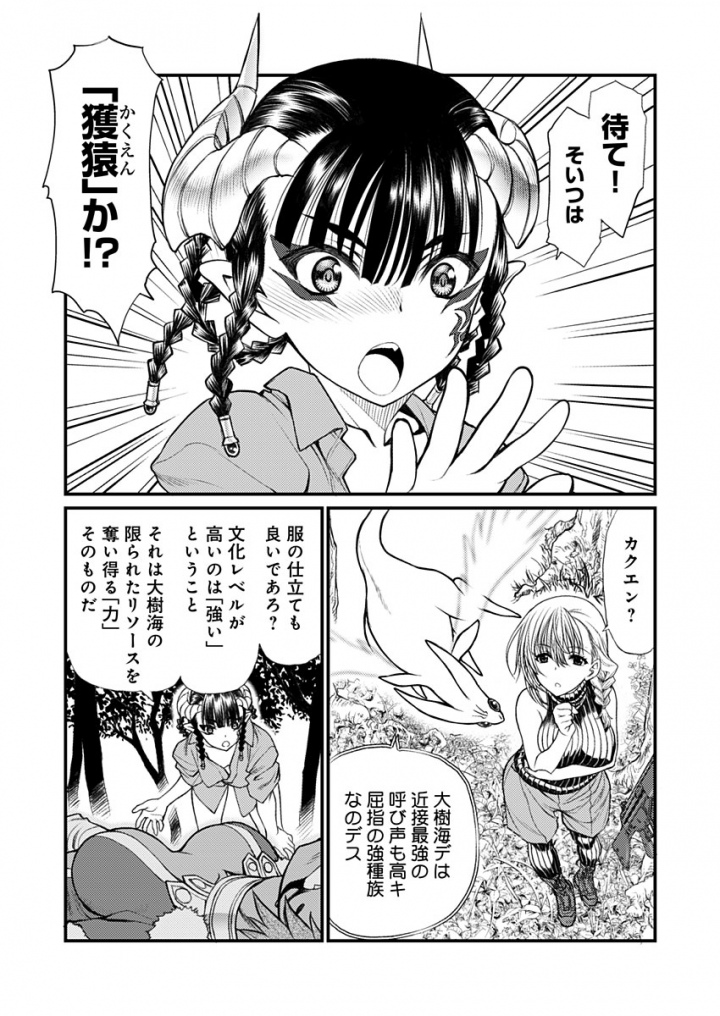 Really... they give the monkey-girl a pathetic death without even seeing what she transforms into, molest her while looting her corpse (while specifically noting the female warriors in her race wear skimpy outfits to prove they're untouchable), steal her abilities and when Chizuru comes back to reflect on how she just killed a person it isn't to pay respects or bury her, no. Since the demi-human was a threat to the absent Atsushi, she's glad to have killed her while he wasn't looking and just plays with her blood for a bit before leaving her to rot there. The poor chocolate monkey is thoroughly humiliated in death. On top of that, this is after they spared the first girl they fought and they actually revive the next dangerous monster girl they kill. The busty monkey was only killed with such prejudice because the sniper girl is that murderous when her companion isn't around.