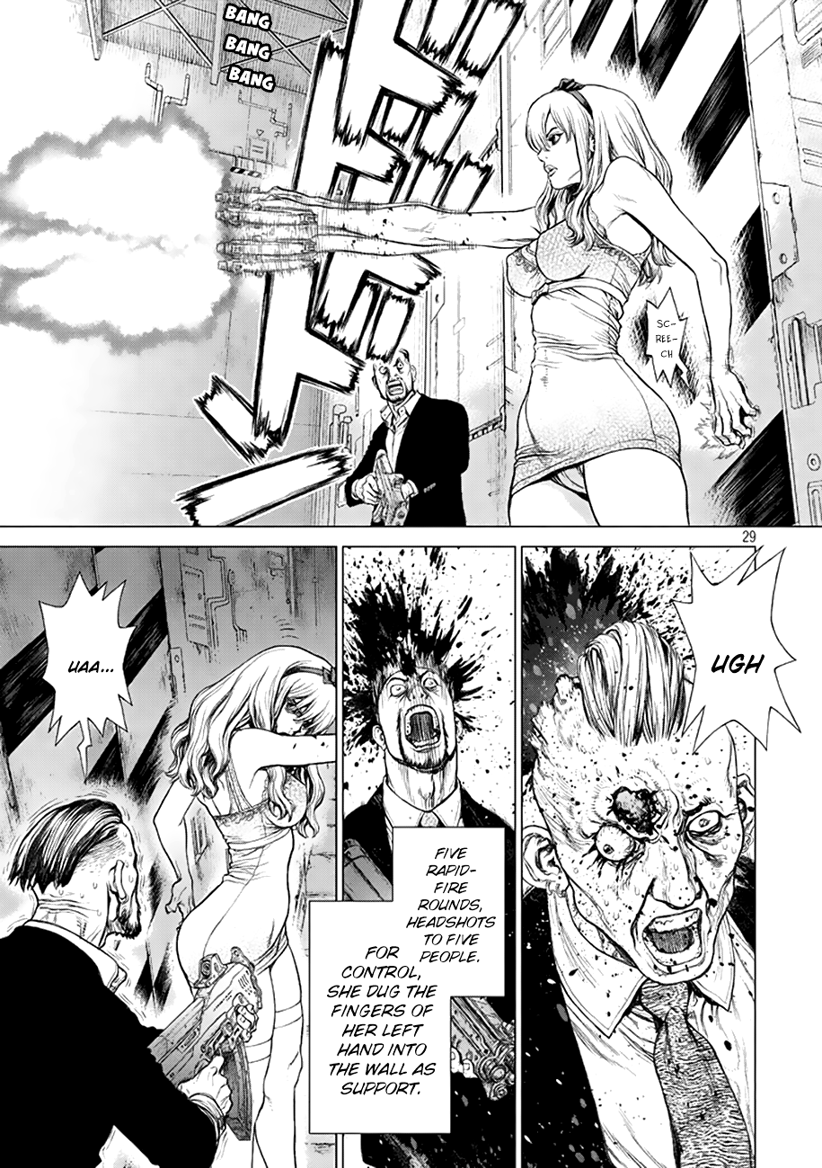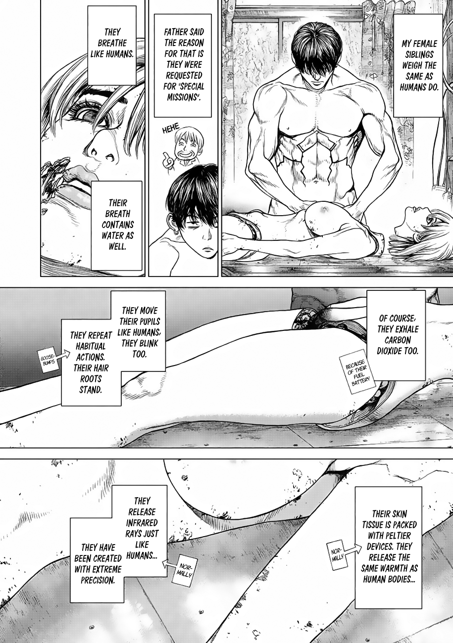 Sci-fi story about androids who hide in society and harvest human bodies to survive. It wastes no time in deploying a small-time snuff bait villainess: the protagonist quickly kills an evil robo-woman named "Da" in the first chapter and puts her mutilated nude body on an operation table to take her components for himself.