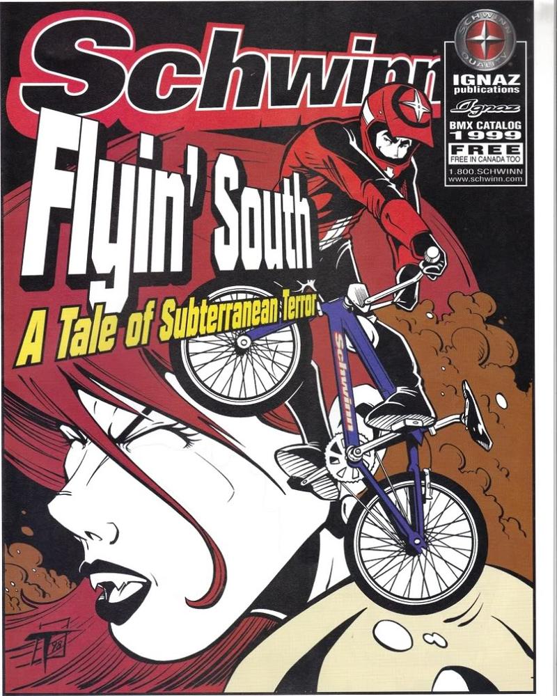 I'll preface this by saying that I vaguely remember it. I remembered seeing the cover at a bike shop, flipping through it, thinking it was strange even back then, and not taking it because I wasn't in to BMX bikes. So why would I need a Schwinn BMX catalogue comic? Over the years I had filed it into a thing I didn't actually remember, a dream, something that I imagined. Cause not only was there no reason for it to happen, if it did, someone would've talked about it. The thing I remembered was so god damn crazy that someone would've talked about it.