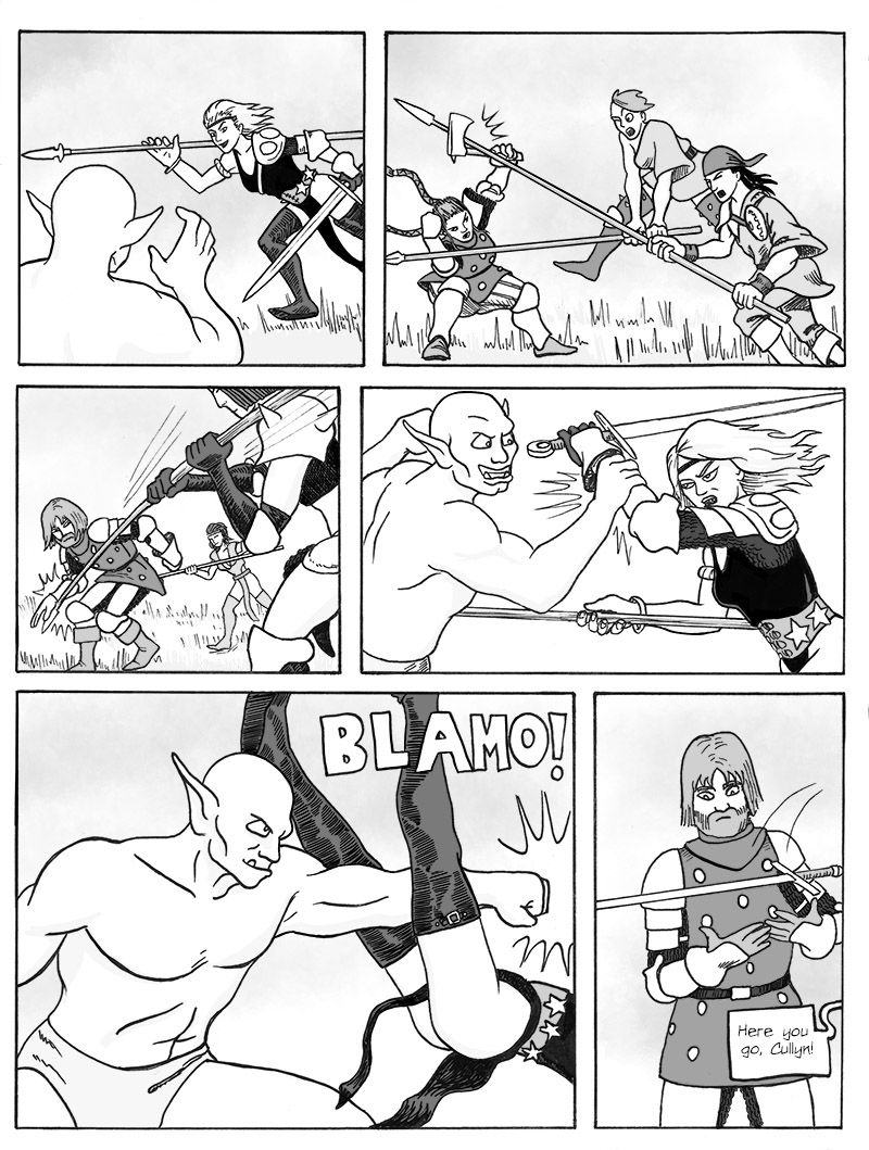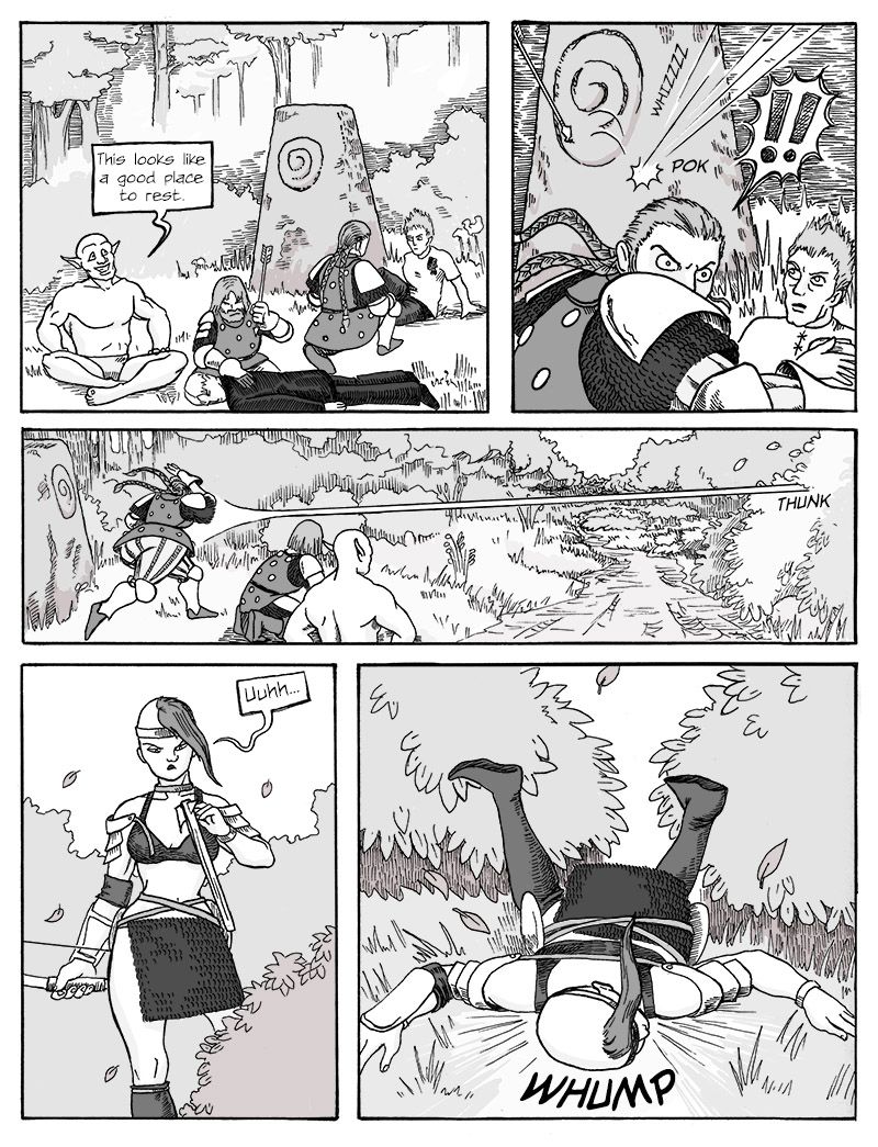 The leader Fiddich heals Burgie and the villains realize the fox Sin is the brains behind Percival and his friends, so they try killing it. However, the fox is the overpowered knight Lancelot in disguise and he pulverizes the villains. Burgin is snuffed for good with an arrow between the breasts and Lancelot carries her half-naked corpse posed tits-up over his shoulder to bury her.