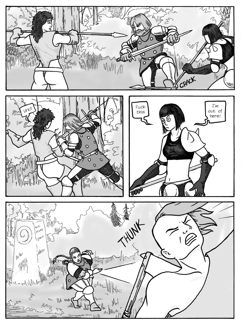 Burgie is a slutty busty sorceress in a bikini and a bizarre helmet. She's introduced immediately getting a hole torn into her chest by her possessed teammate... but it was just a mirage decoy spell in her place.
