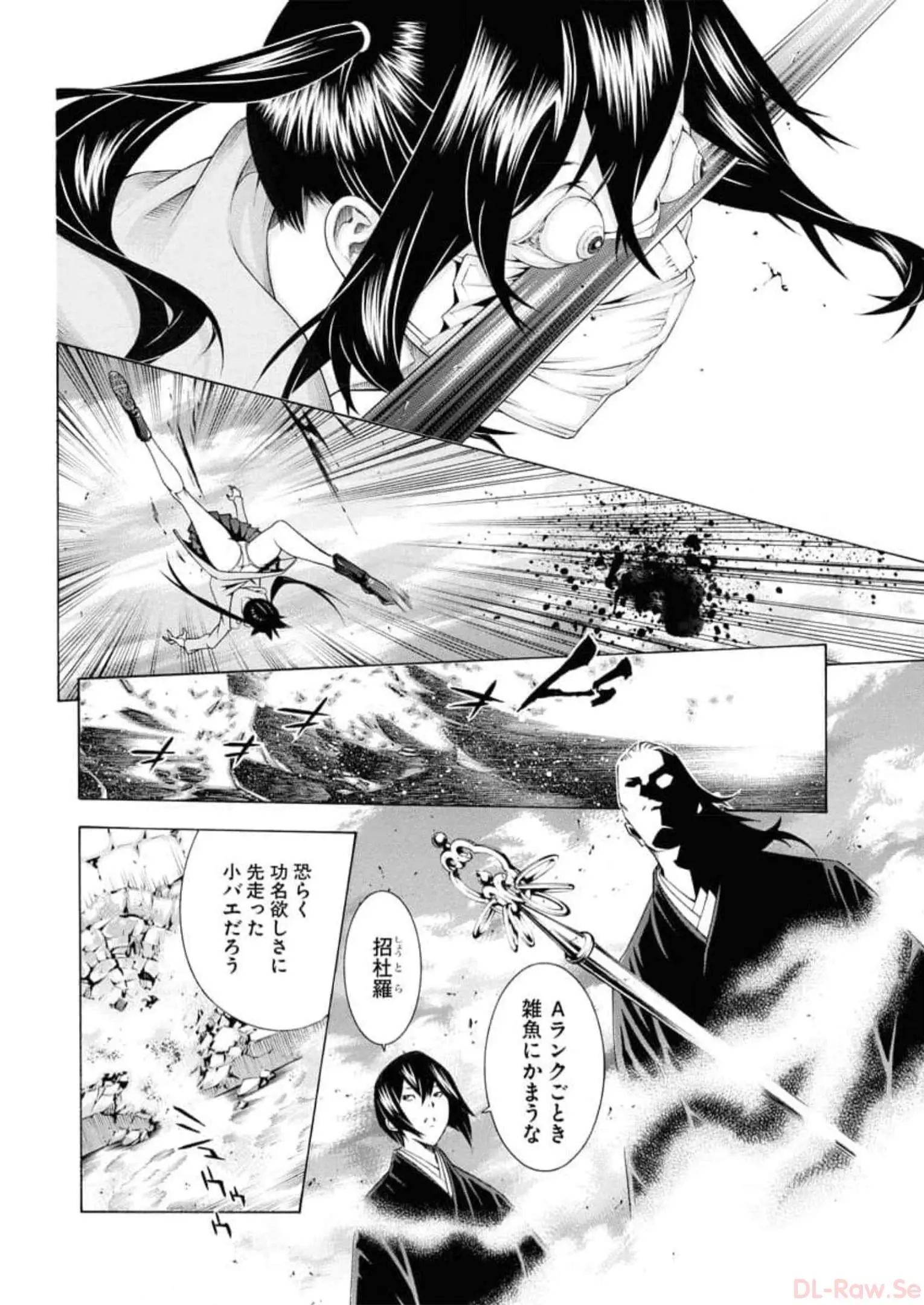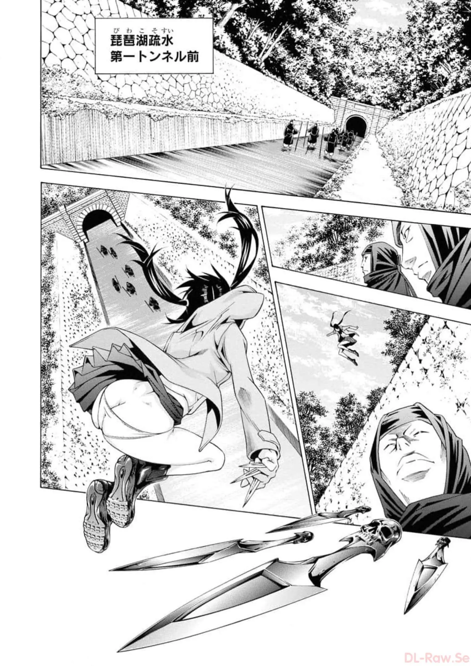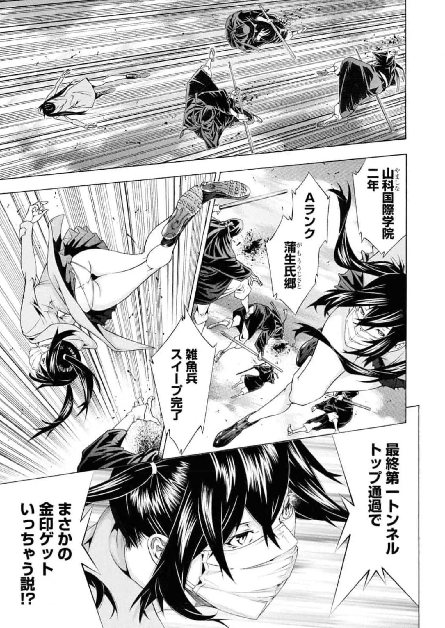 Manga about ninjas with bug-like powers. Early on, the protagonist is attacked by a kunoichi named Iroha who has spittlebug-based pissing powers. She's caught on the act the heroine and is cut in half, but turns out to be some kind of clone. The real one doesn't last much longer, though. She tries to capture the enemy clan's leader but gets snuffed offscreen, dying covered in her own bubbly piss (and ironically with less of her naked body shown than in previous scenes).