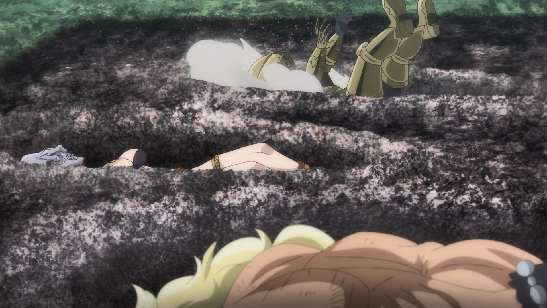 The leader Fiddich heals Burgie and the villains realize the fox Sin is the brains behind Percival and his friends, so they try killing it. However, the fox is the overpowered knight Lancelot in disguise and he pulverizes the villains. Burgie is snuffed for good with an arrow between the breasts and Lancelot carries her half-naked corpse posed tits-up over his shoulder to bury her.