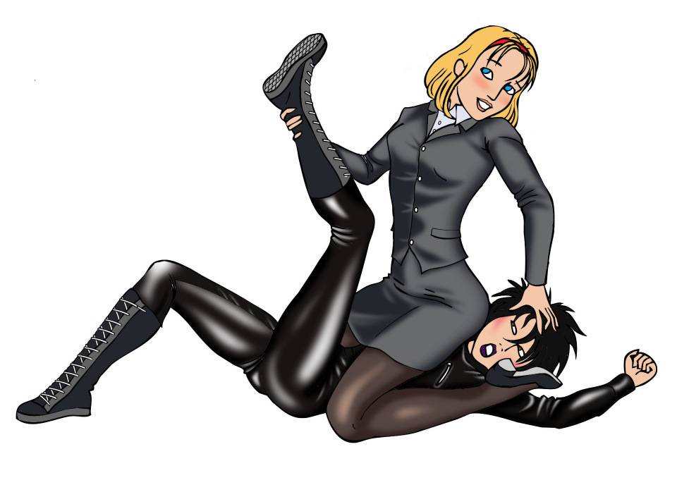 Cookie was running on instinct. Her dreams were right in front of her and she just had to take them...and so she attacked Vivian. It was like heaven as she pressed her breasts into the woman like in her video. Vivian tried to run but Cookie already had her by the legs. Pulling her back. Cookie quickly mounted the leather clad woman. Using her weight to push her down.she then yanked her leg up. "Oooo this is a really nice suit, Vivian!" she said rubbing her leg. Cookie quickly placed her legs on Vivian's arms. She had vern seeing this in her videos and needed to try. Lifting herself up she hovered her hips over Vivian's face. Giving her a good look at Cookie's white undies. Smiling wide as she lowered onto the burglar's face. Shaking her buttocks playfully.