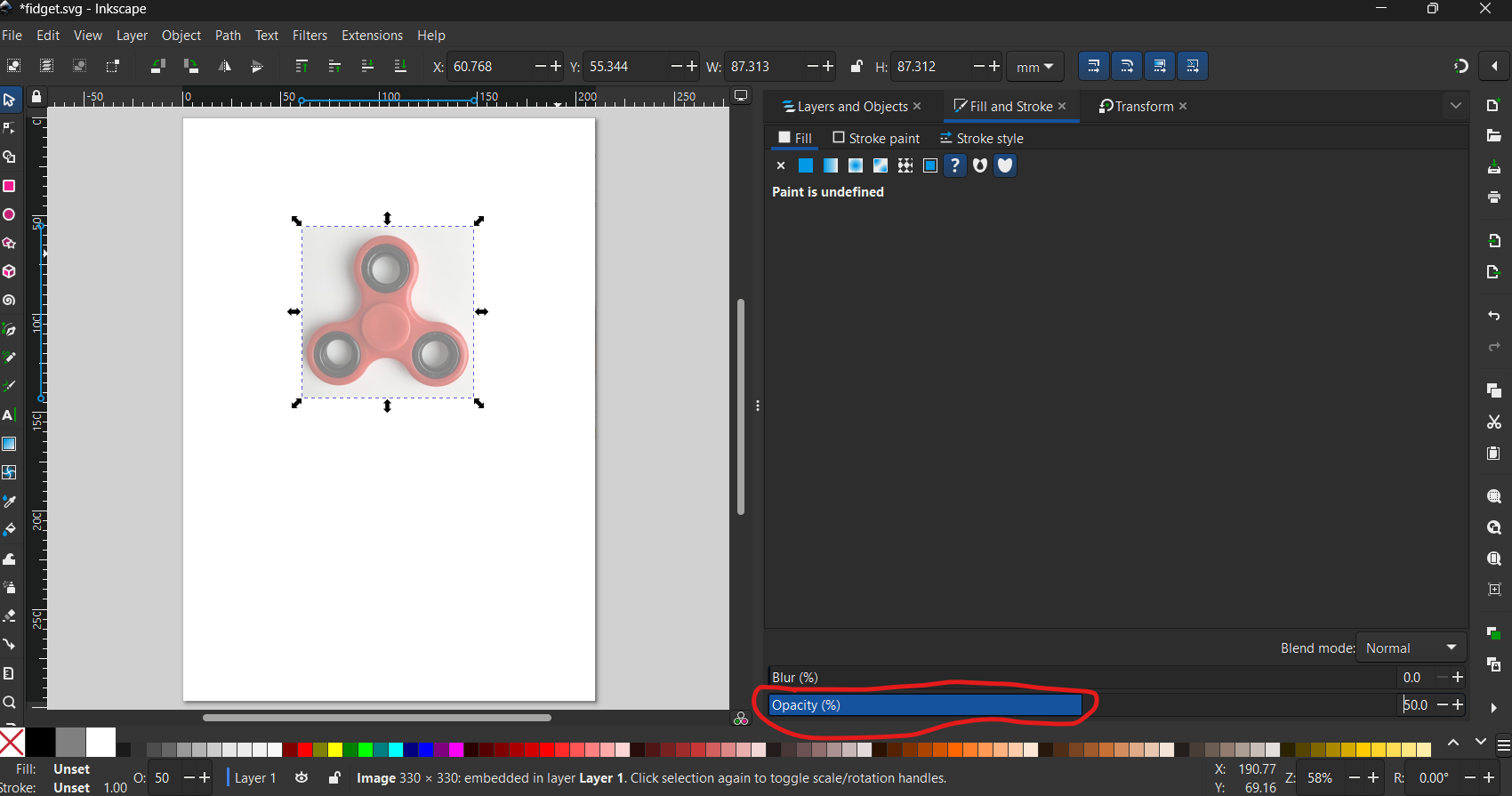 1. Open up the Inkscape document we were previously working on. Select the ring reference and hide it. Now, select the fidget spinner reference and set the opacity to 50% . Your screen should look like this now: