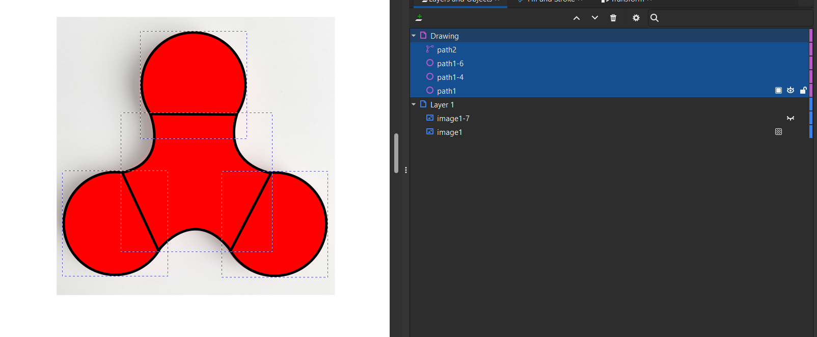 7. Now, select all the blue circles and make a path union out of them like I showed you before. You should have two paths now: A path containing the red fidget spinner body, and a path containing the 3 circles. Make sure that the path containing the circles is ABOVE the path containing the red fidget spinner body. Your screen should look similar to this: