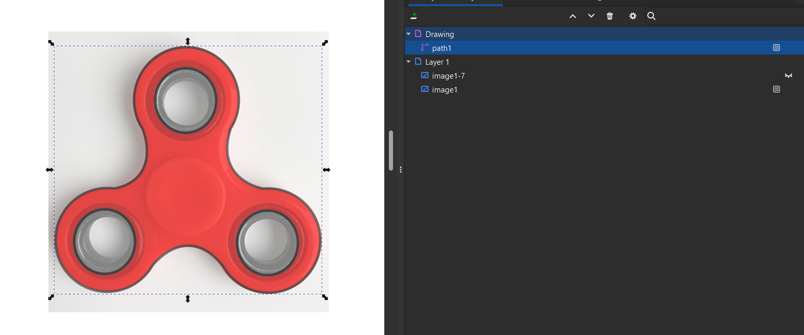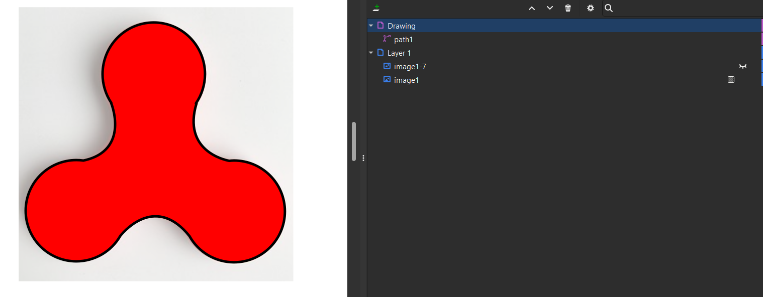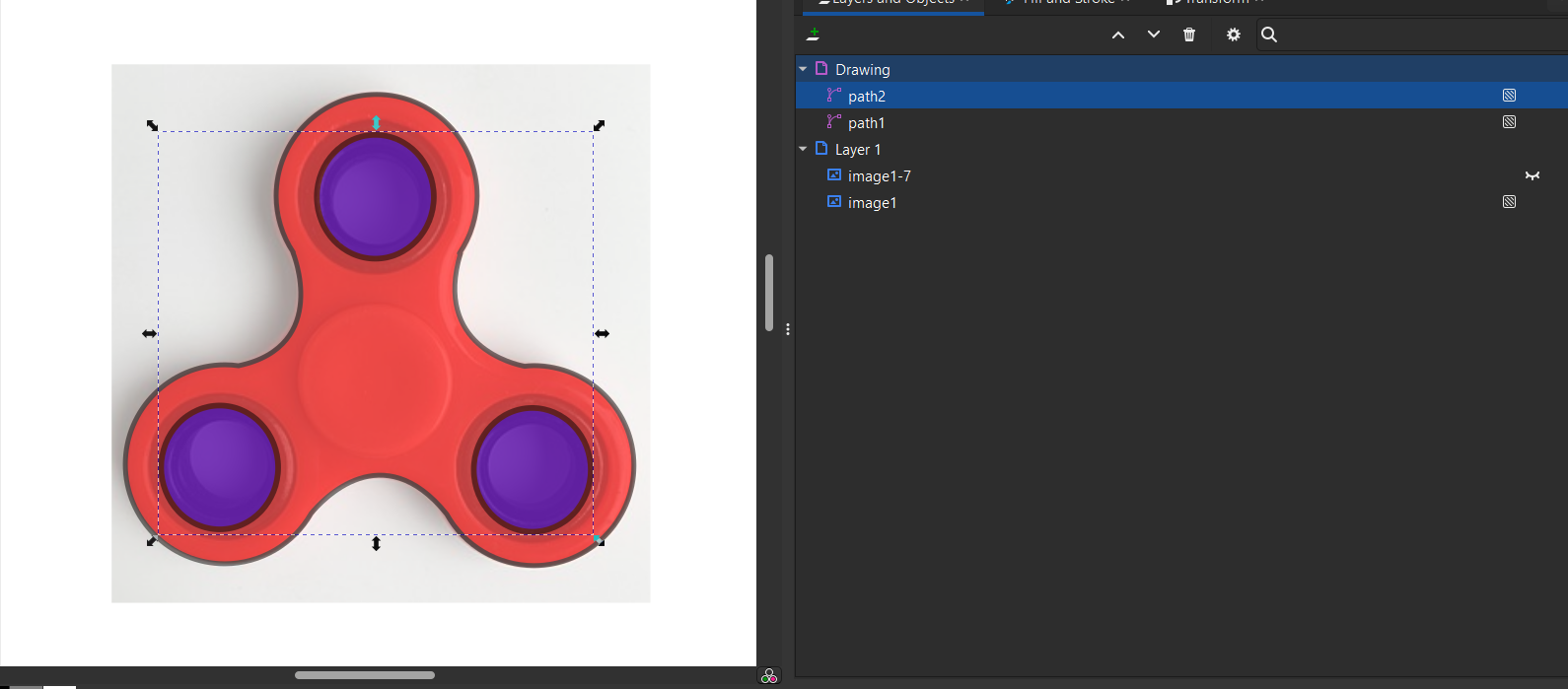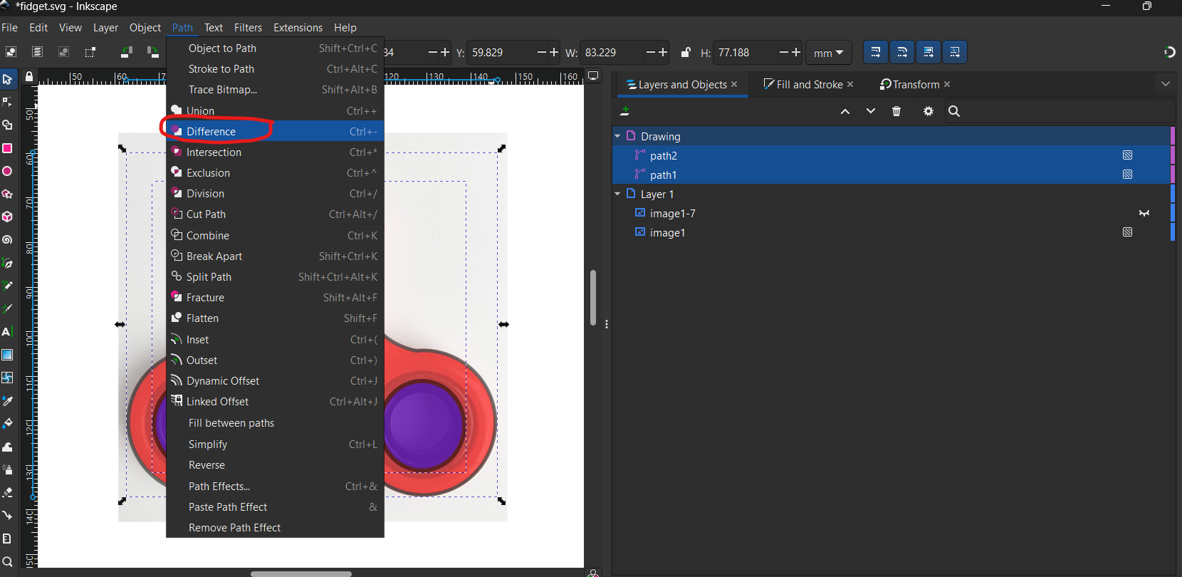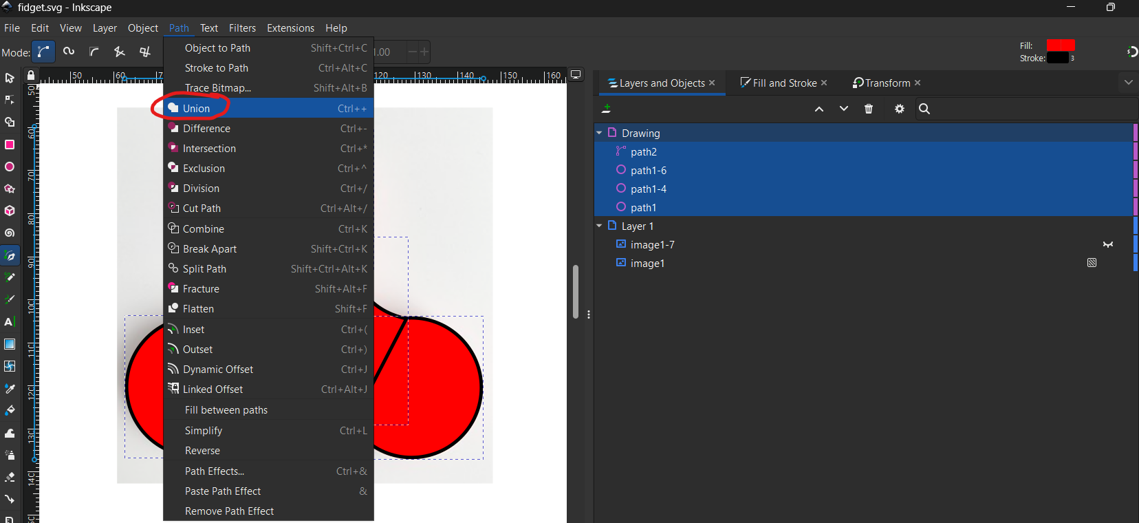 6. Notice now that the fidget body path (path 1) has been split into two paths. One path is the inside red filling, and the other path is the dark red outline.