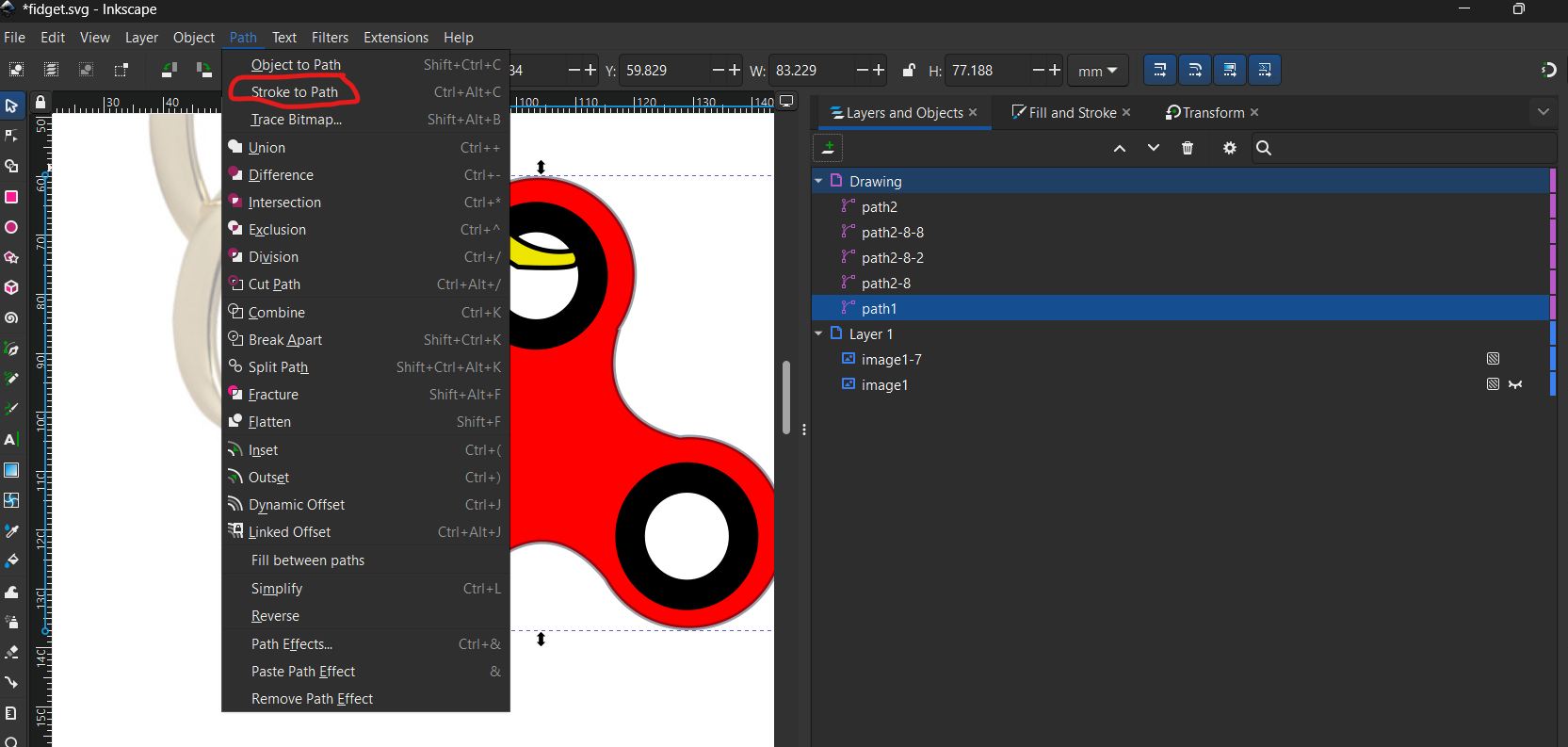 5. Make sure you are happy with your art at this point, because the following steps are difficult to reverse. Save a copy of you art at this point if you are worried. Select the fidget spinner body, then go to Path, and select Stroke to path. This will separate the outline from the fidget body and turn it into a separate editable path.