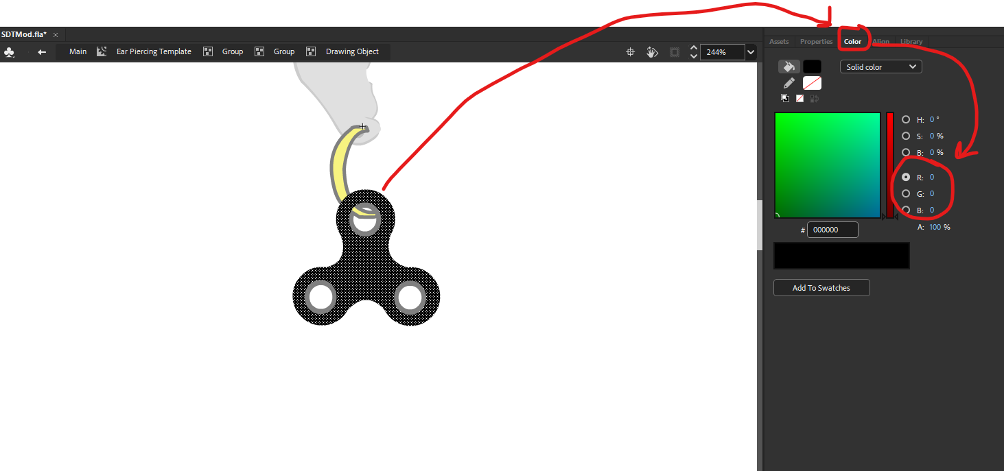 10. This step is optional and can be done later in the process. You need to make all the colored parts that you want to be able to change color completely pitch black. You can perform this step in Adobe Animate as well. Select the fill and set the color to 0 red, 0 green and 0 blue. Notice that we didn't make the ring pitch black? That's because we don't want its color to change.