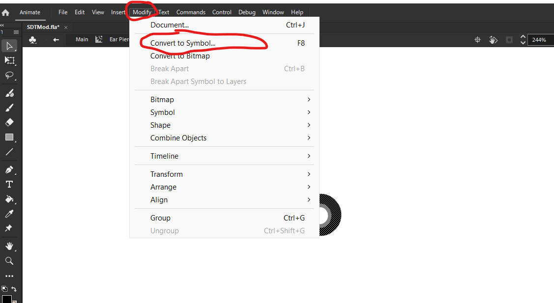 3. With the pitch black fill still selected, go to the top tabs, select the Modify tab, then select Convert to Symbol