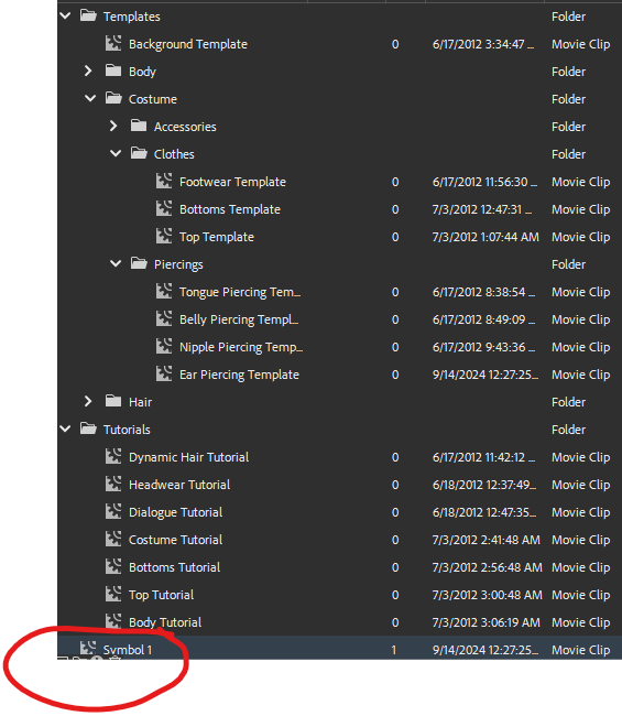 5. Your newly created symbol will now appear at the bottom of the library list. Use count 1 means that this symbol is being used 1 time. It is being used in the ear piercing template we are working on