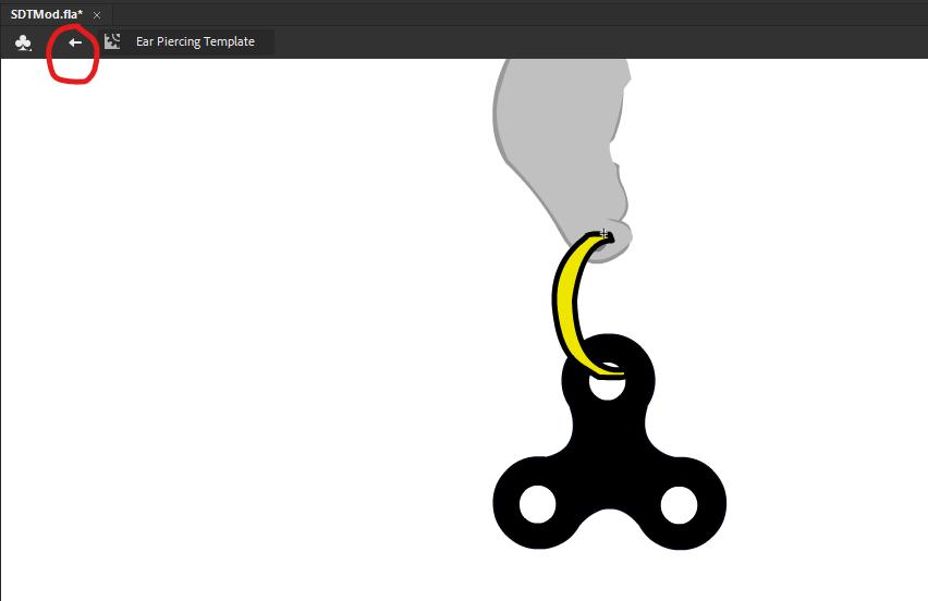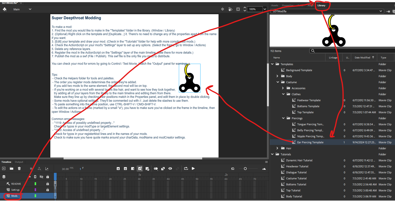 10. Once you are in the main stage, select the Mods layer, open the library tab, then drag the Ear Piercing template onto the main stage. Steps outlined below: