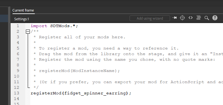 13. First, we will register our mod. Remember when we named our earring template instance "fidget_spinner_earring" ? This is the name we need to register our mod with. Put down "registerMod(fidget_spinner_earring);" without quotes. See the screenshot below: