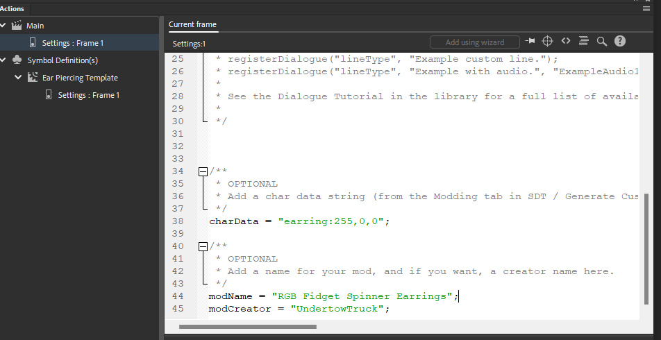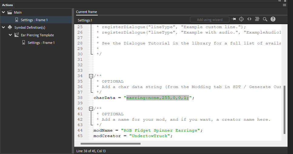 14. Scroll down to see the rest. We are ignoring the dialogue portion, you will likely never use this part. For the charData, do charData = "earring:none,255,0,0,1;";. This will set the earring color to RGBA(255,0,0, 100%) or pure red color. You can also add a mod name and your creator name here, too.