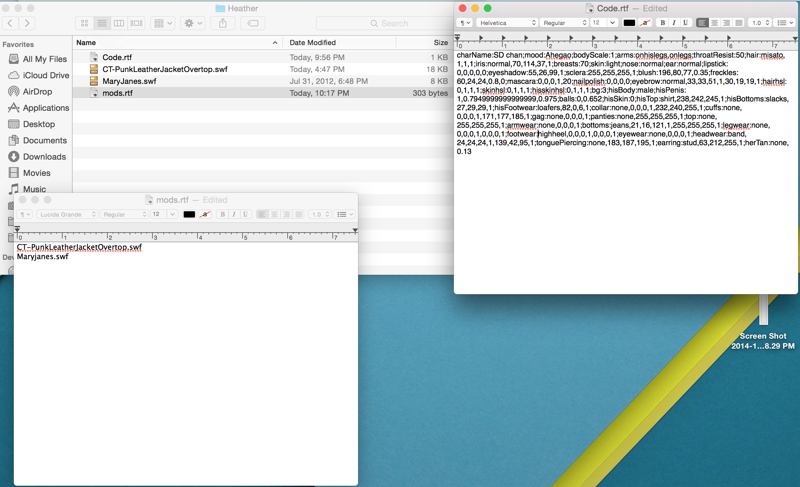 I'm on Mac OSX Maverick, I'm using the stand alone Adobe Flash, and I've read the tutorials on saving files, although prior to that I had been saving some characters with good luck using the in game system. When I started having trouble I read the guide and had success using it with some .swf files. I noticed that others wouldn't work and now, none of them will work. I noticed that when I generate custom save data, its not adding any of the .swf content to the code like it had in the past. I added the code in manually and was able to get some items to pop up (a tail that I was just using to test the code) but not others. Attached is a pick of my code and folder setup to try and prove my mods aren't being saveed in custom save data. The files are .rtf right now, but I change them to .txt after I close them.