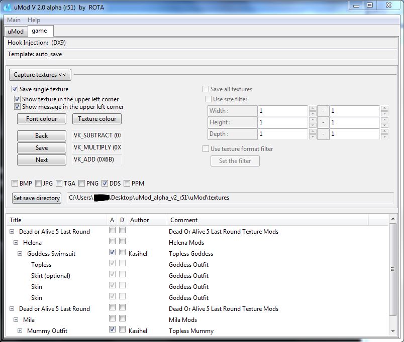 Very awesome! Also, hope you don't mind, but I discovered that if you make a copy of game_W1024_H1024_F827611204_T_0X47535167F2B4D645 and rename it as game_W1024_H1024_F827611204_T_0X51E8FF9CFA7AF32C, you will have Ayane's VR suit the same as Kasumi's, since they already are sharing the back and ass texture. So two for one! :)