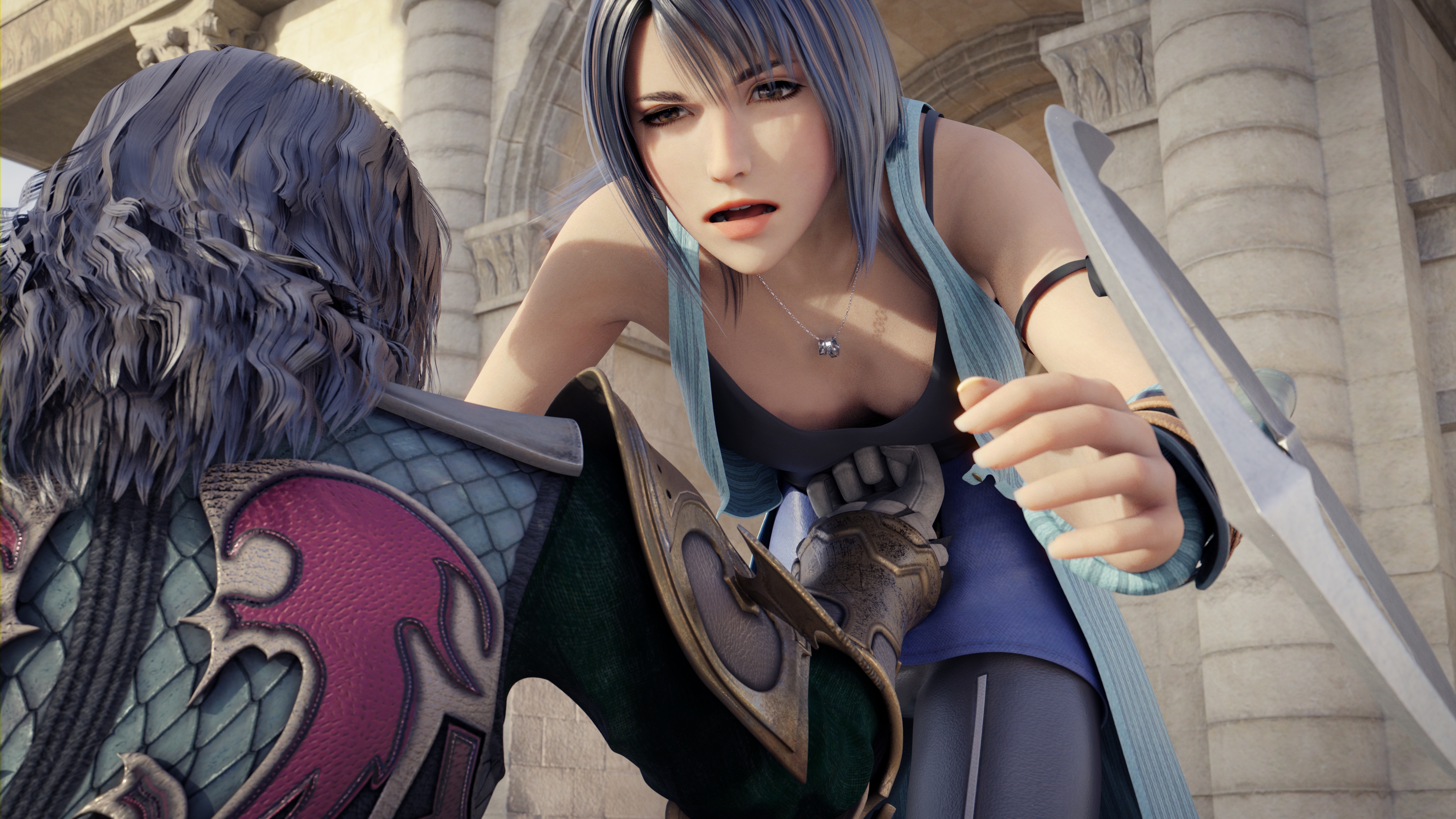 Luckily for Yuna, her summoner's garb was thick enough to absorb part of the impact. Unlike Rinoa, who had only a thin tank top, she was able to to prevent herself from dropping to her knees.