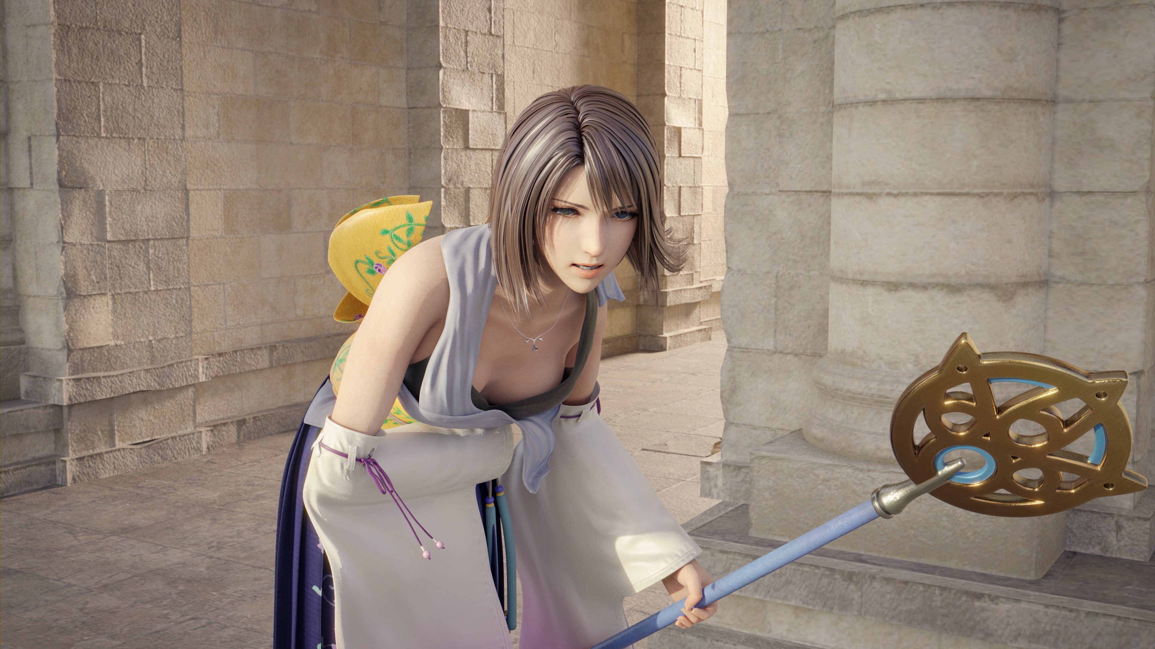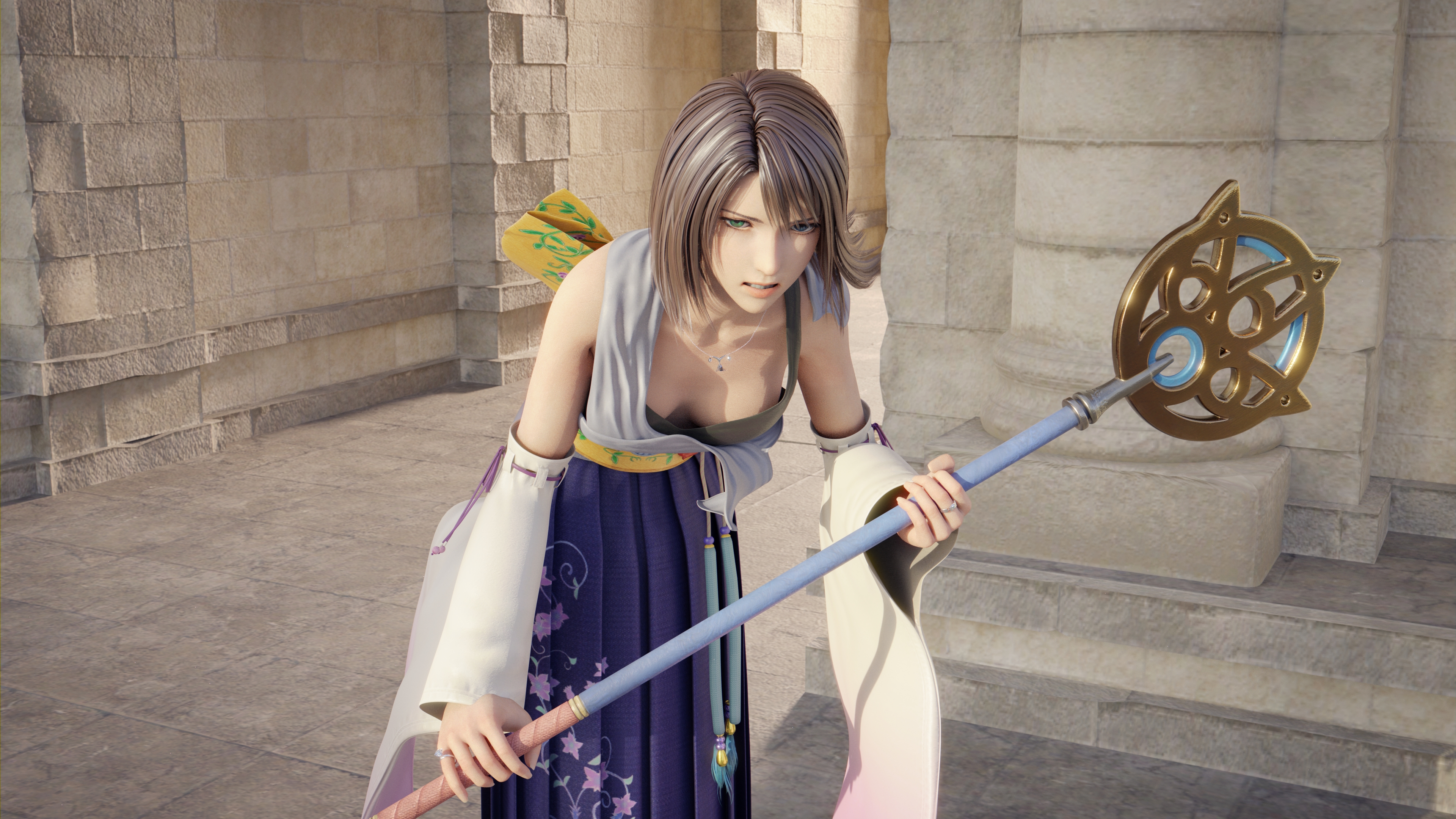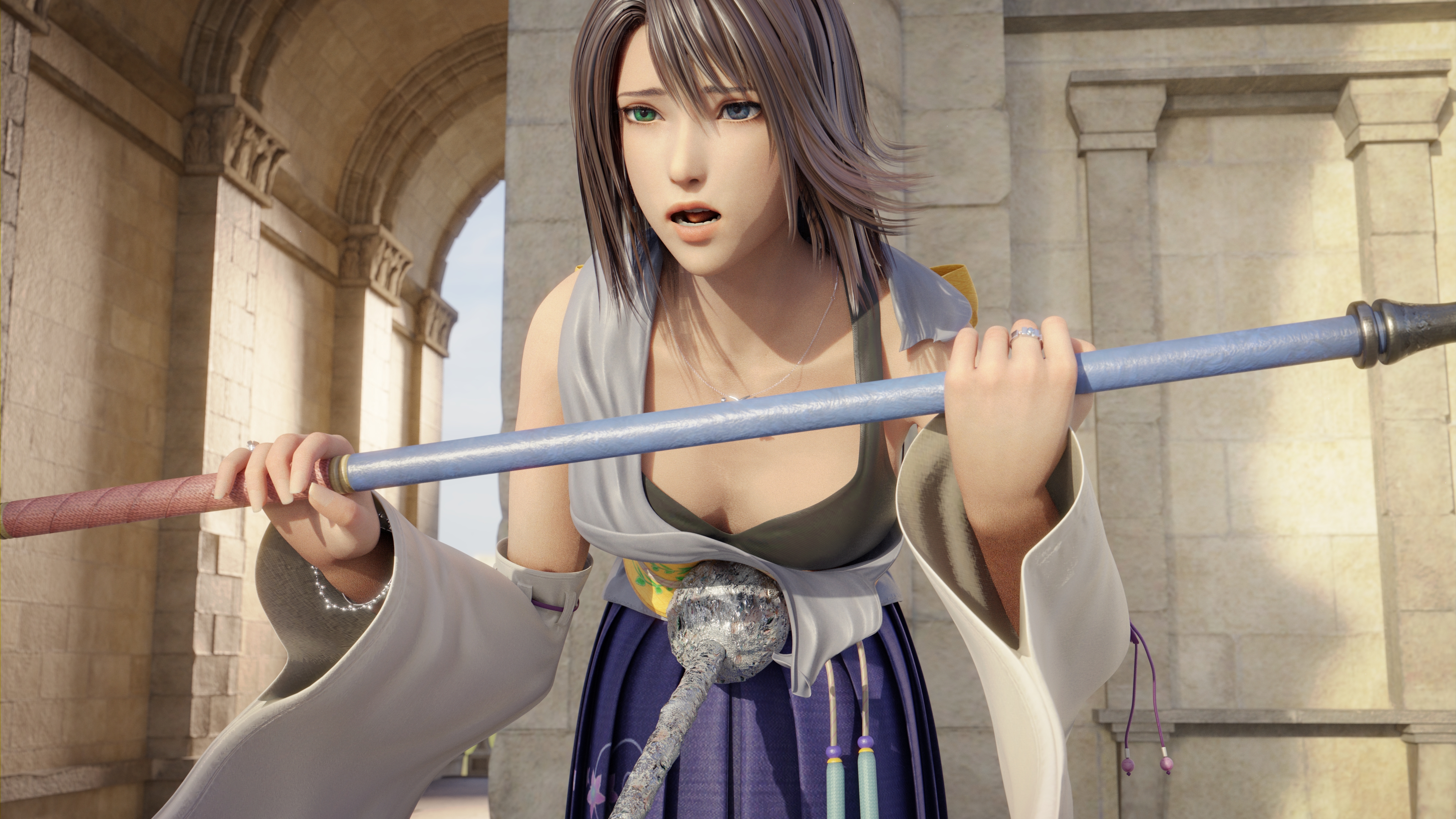 Yuna expected a strike at her face, and raised her weapon to defend herself. What she didn't expect was a heavy strike into her unprotected belly.