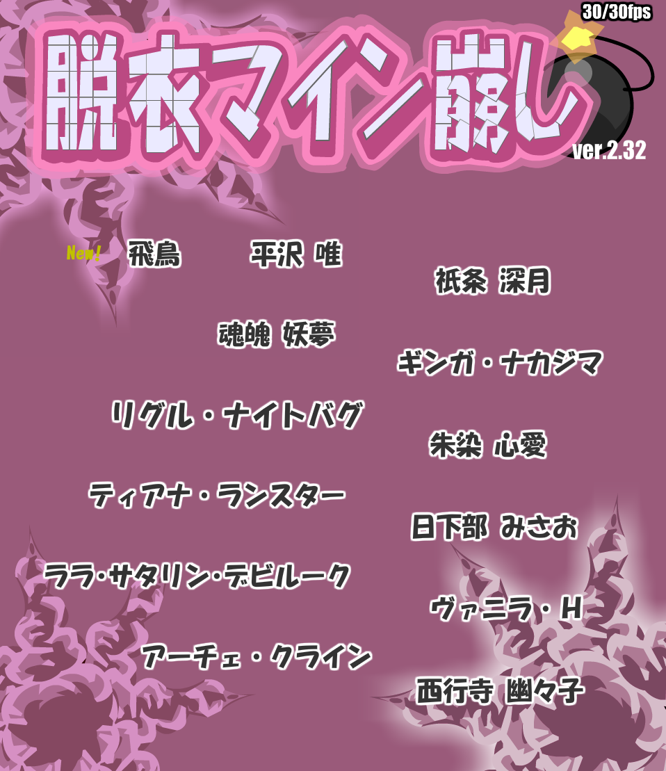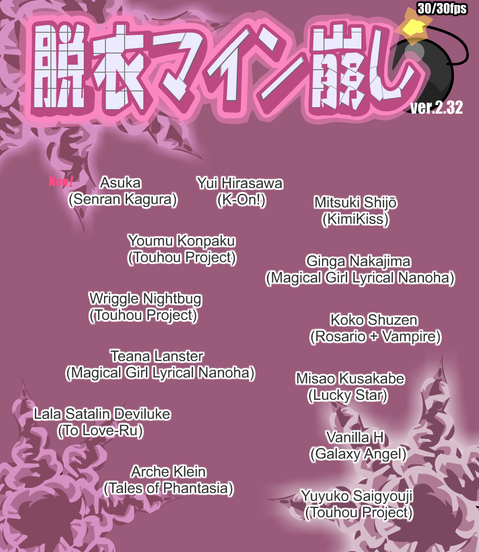This flash game is a fascinating combination of Minesweeper and Breakout. There are 13 female characters popular in Japan available at the selection screen, and after choosing one you will attempt to clear each stage of the game in order to remove her clothing. Play progresses until she has lost all of her clothing.