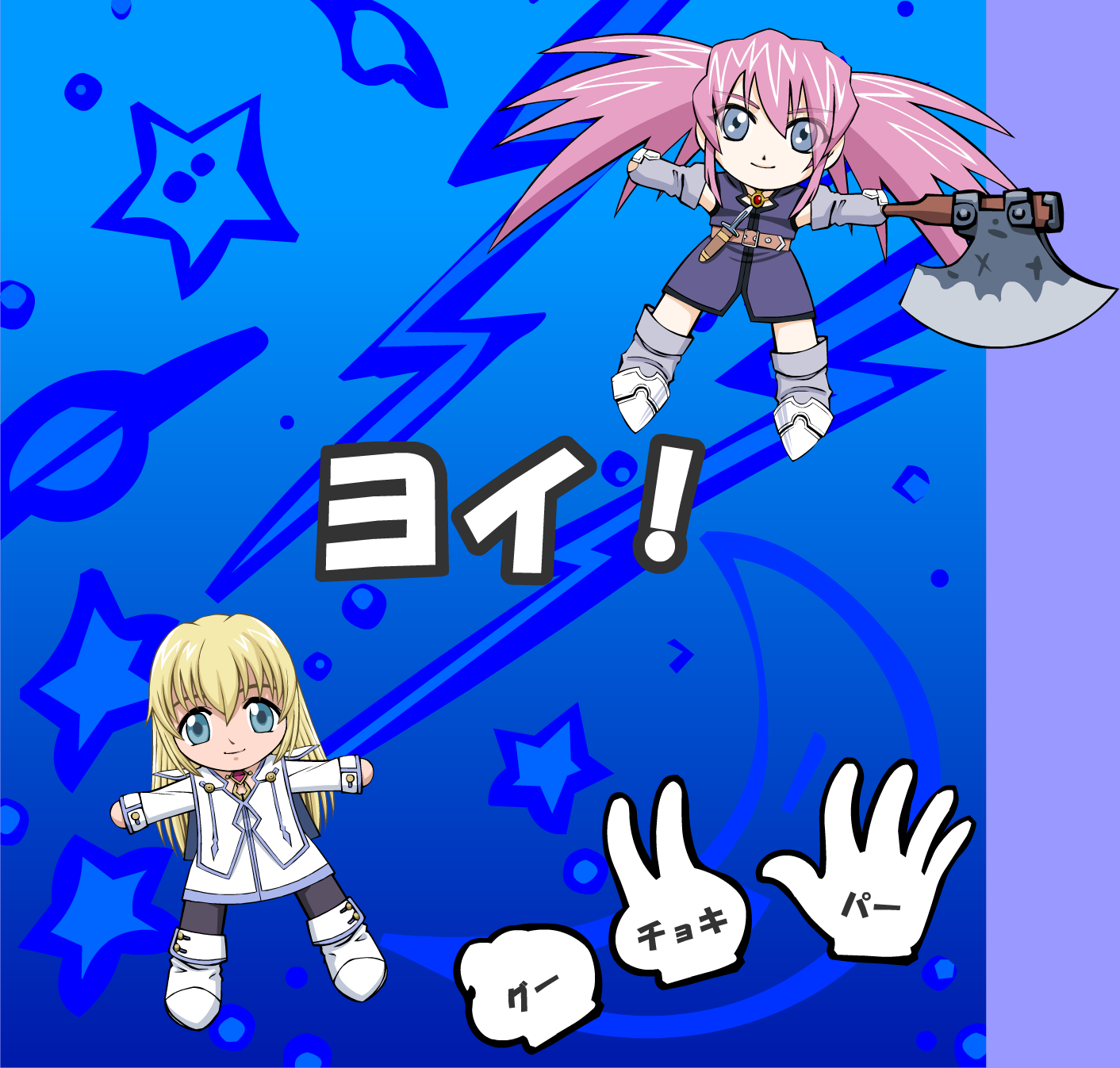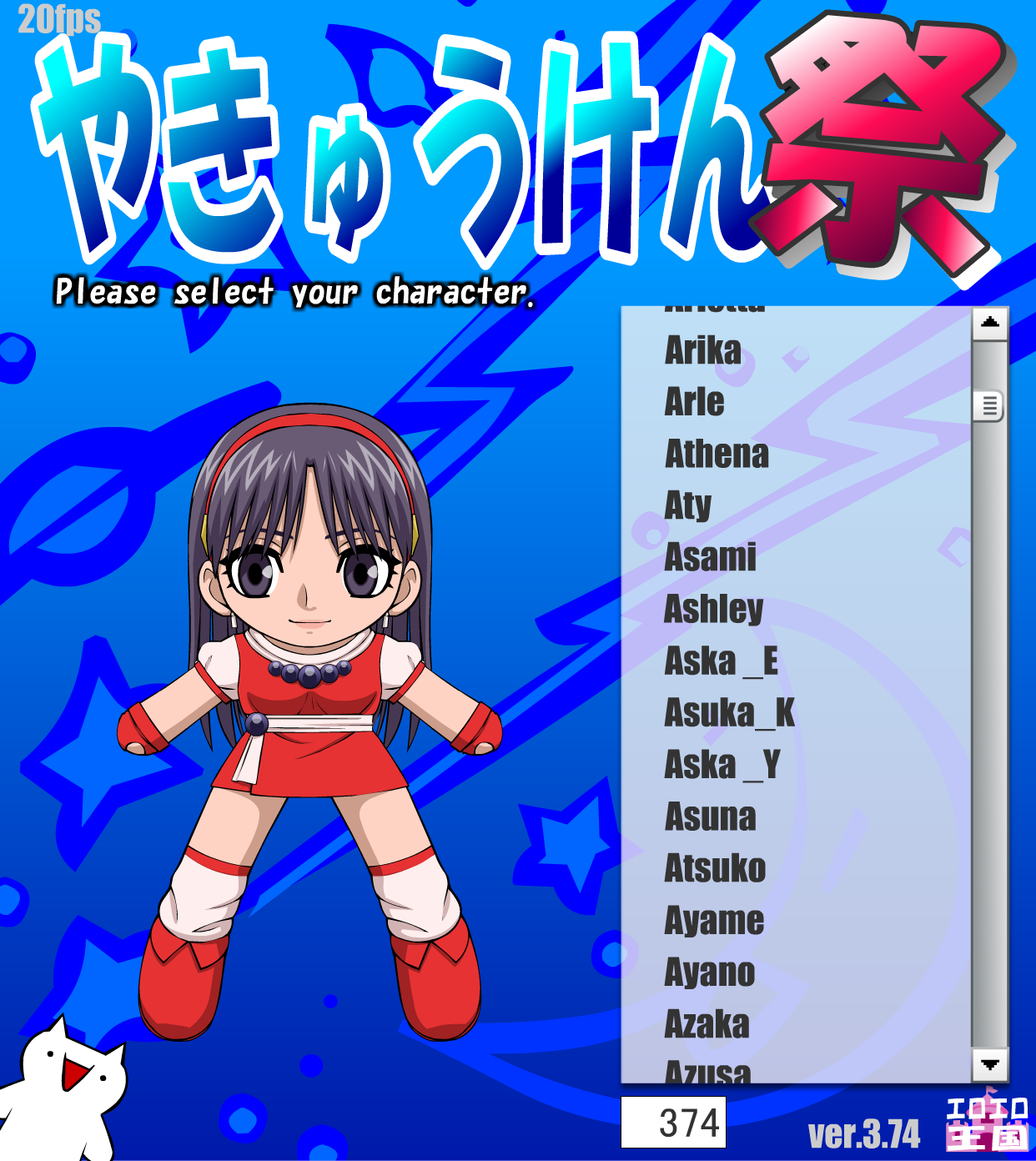 In this simple game of "strip rock, paper, scissors" (the Japanese game of "Yakyuken"; see: Yakyuken - Wikipedia, the free encyclopedia), there are hundreds of female characters popular in Japan to choose from, and you choose two who will compete against each other. One character is controlled by you, the player, while the other is AI-controlled. After each round of rock, paper, scissors, the loser removes one article of clothing. The first character to become completely naked is the loser - although all things considered, even if you lose, you still win!