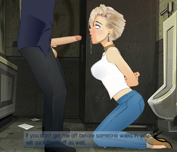 Scene: Male and female in what is most certainly an unhealthy relationship. He is sadistic and domineering. She is masochistic and completely dependent on him. In this scene he has taken her out on the town. *YOU* feel like a break and so pull her into a public toilet for some quick relief.
