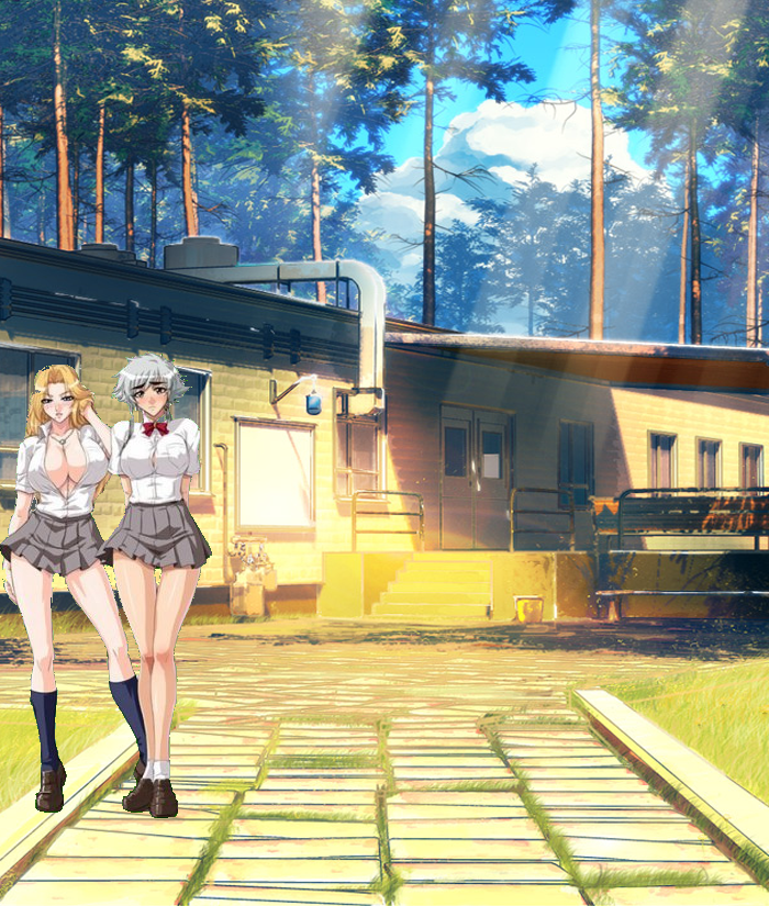 Here is another dialog I came up with after making a couple backgrounds. I used The Hermit's watching girls and a couple of Xiombarg's "Pleasant Scenery" images. One looked a bit like a cabin at a summer camp, and this is what resulted while I was clipping and cleaning the images.