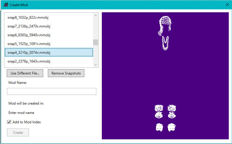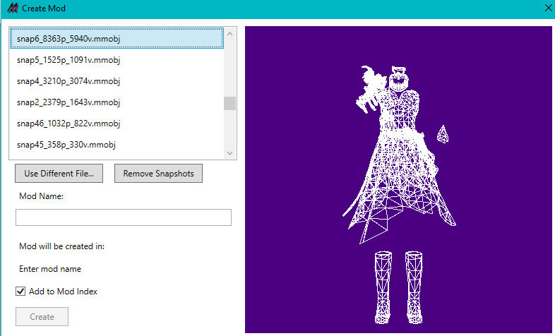 Alt-Tab to MM. Click 'Create mod' (I've edited the Nature's Oath outfit, so I'll use that as reference) Search in the snapshots list for the dress part of the Nature's Oath outfit. Enter a mod name (call it NO Dress or something) and click Create. (This is it)