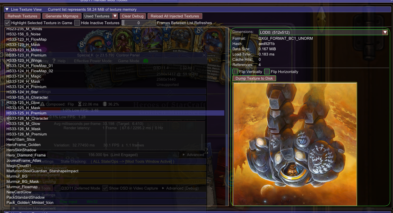This has mostly come up when I've been trying to editing the glow effect of Nova's skin as well as the golden animations of some of the new Starcraft cards too. I'm hoping that someone here might be able to tell me what settings I need to change in Special K so I can hopefully find and edit these missing textures. It also seems to have hidden the space background image for Nova's skin too, but that seems to update to her texture after loading in as her in a game as that class (Changed in my Shaman version of her, but not the Warrior version as I've not played that deck yet since starting to mod her skin)