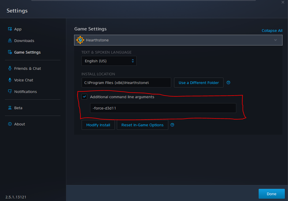 Step 5: In Battle.net click the settings cog next to the play button. click game settings. Click the check box for [Additional command line arguments] and copy paste -force-d3d11 into the field. It should look like this: