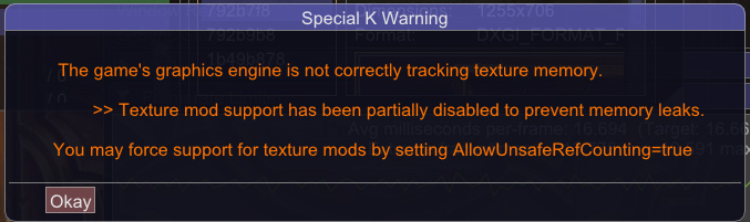 Urgent question: I logged into the game after a recent patch and I stopped showing the textures of the game, only those that I made. The original textures of the game are not displayed in the program. And such a message is also displayed. I'm using an old version of SpecialK, since the new ones don't work on Windows 7. How can I fix this? Thank you in advance for your help!🙏