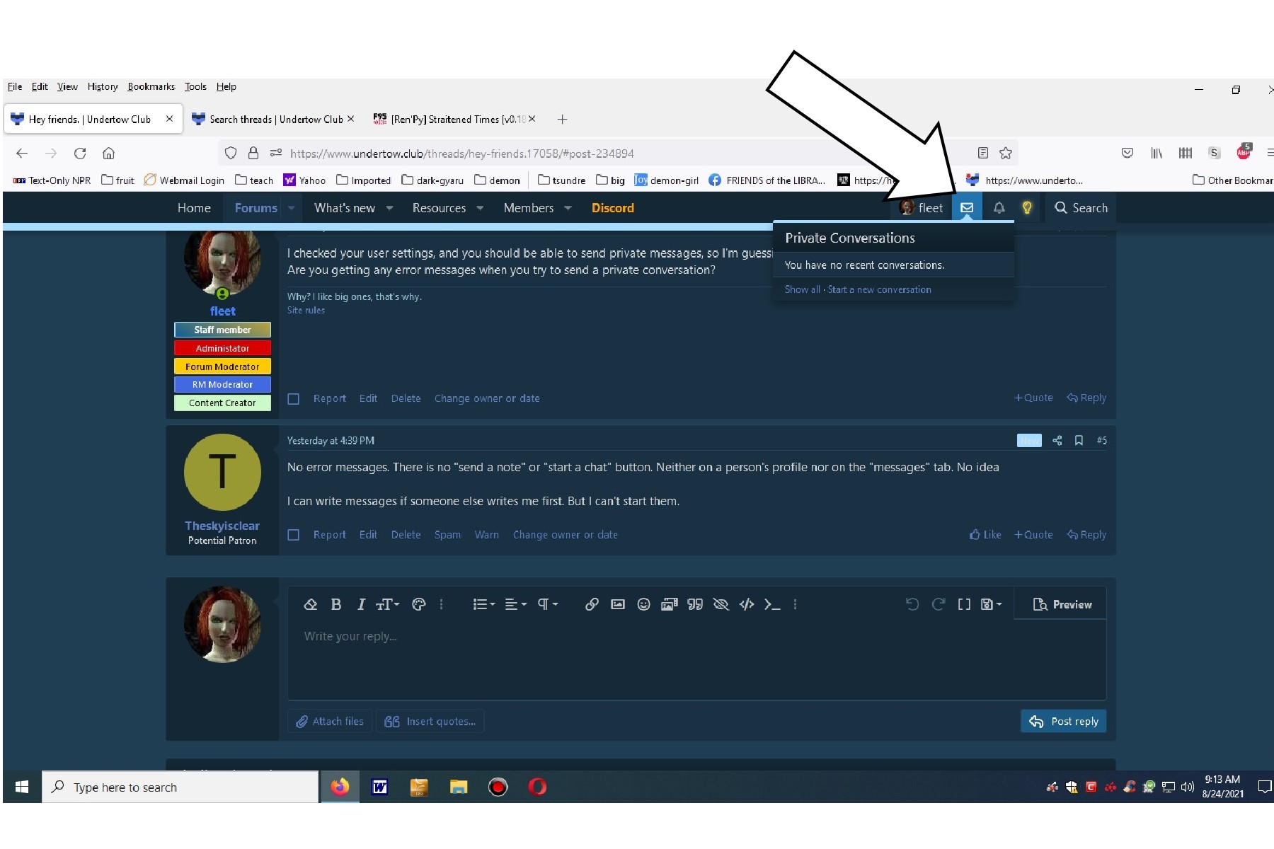 Are you getting any error messages when you try to send a private conversation?