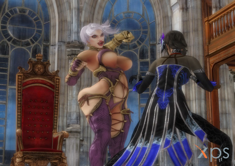 both women get in their fighting stances. Wang takes a low bird like stance and ivy just bares a sword down on her opponent.