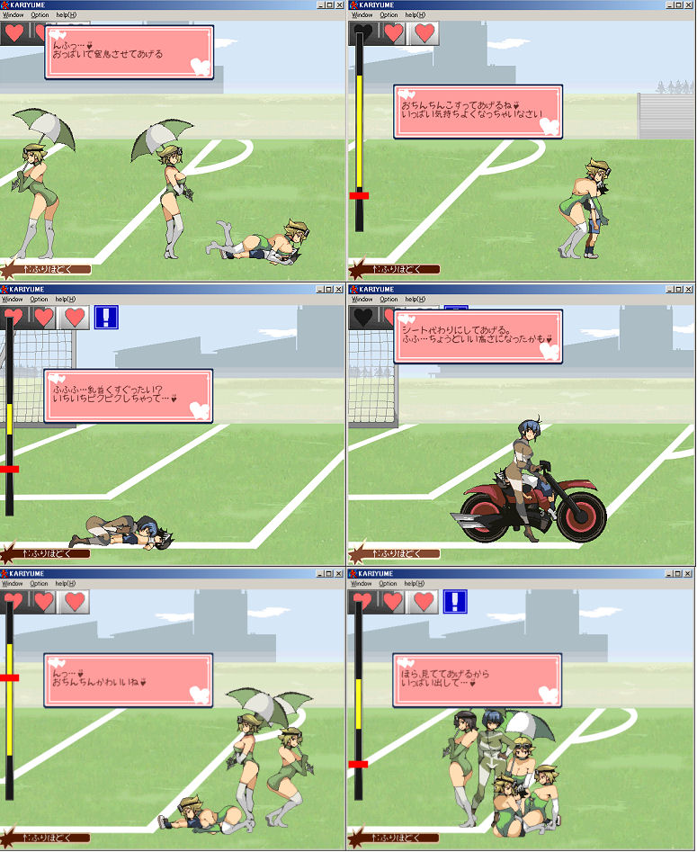 That number is the amount of enemies piling onto the player at once if you have multiple enemies. I was able to capture the race queen zako from Kariyume. I promise to capture the racer boss next. When zzinzinz added the two enemies to the Kariyume game, he did not include the artwork. What I did was screen capture the game and pasted the image in the Paint program. Like every enemy in this game, race queen has a unique quote for each specific attack, but the end quotes are the same depending on which heart she takes. Regardless of attack, she says the same thing upon taking the first heart and so forth. I attached the images as a progression from each attack from the first heart all the way to the last heart.