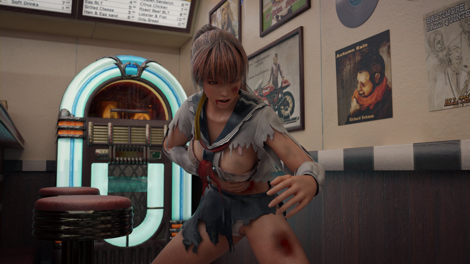 With a sudden jerk, Kasumi awoke in the night. Heart beating wildly, she looked around her. The diner waitress was missing, the lights were dimmed, and she was alone. "I was drugged!", she realised. Disoriented, she stood up, dizzy and nauseous, and stumbled towards to the door.