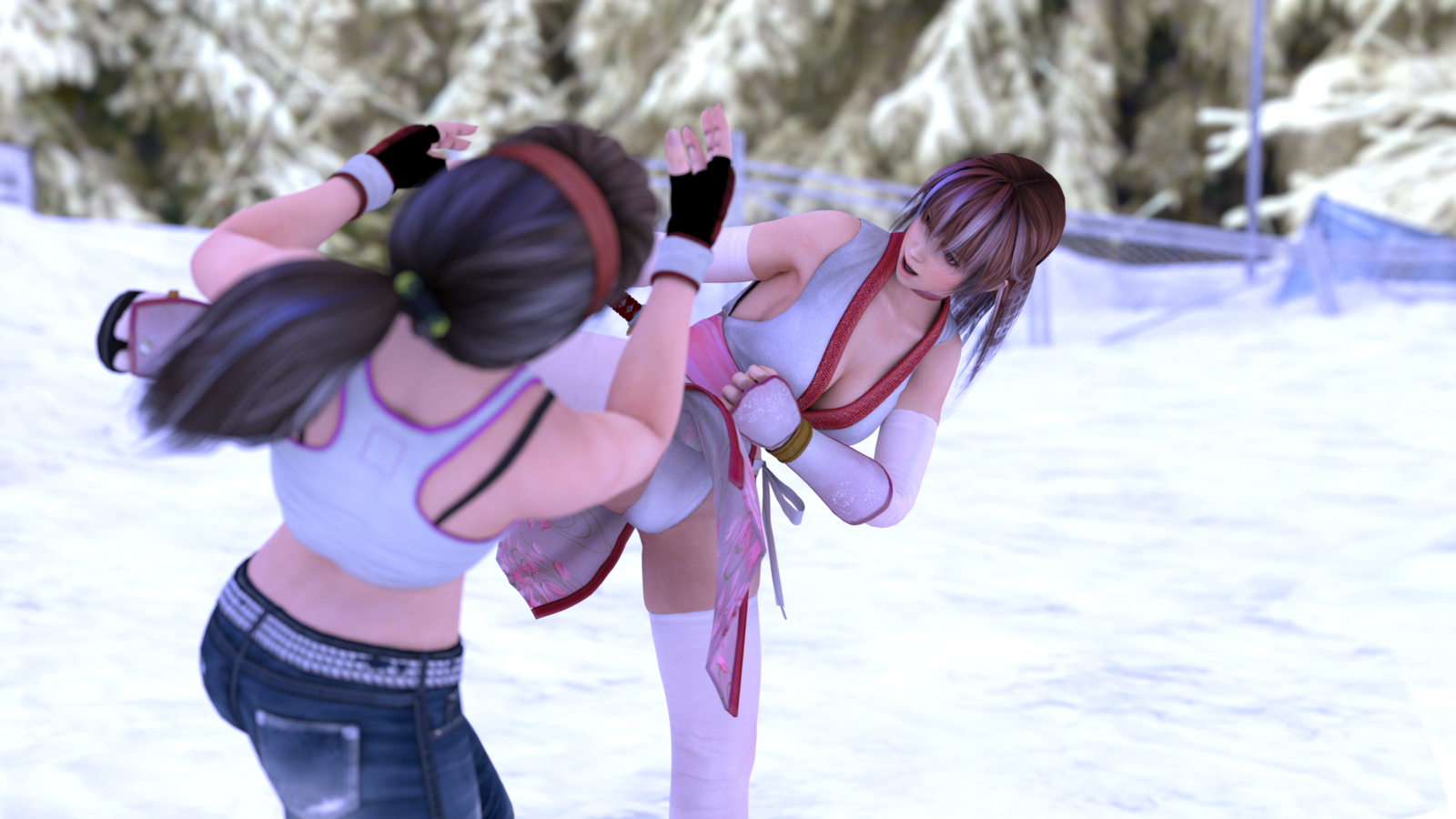 Hitomi had problems dealing with Kasumi's speed, evading her strikes and countering with ease. But she had never gave up. The opportunity came when Hitomi feinted, and Kasumi automatically countered. Grabbing her wrist, she brought Kasumi close, where there was a brief struggle for control. Being the stronger of the two, Hitomi finally managed to trap Kasumi's arms and make her pay.