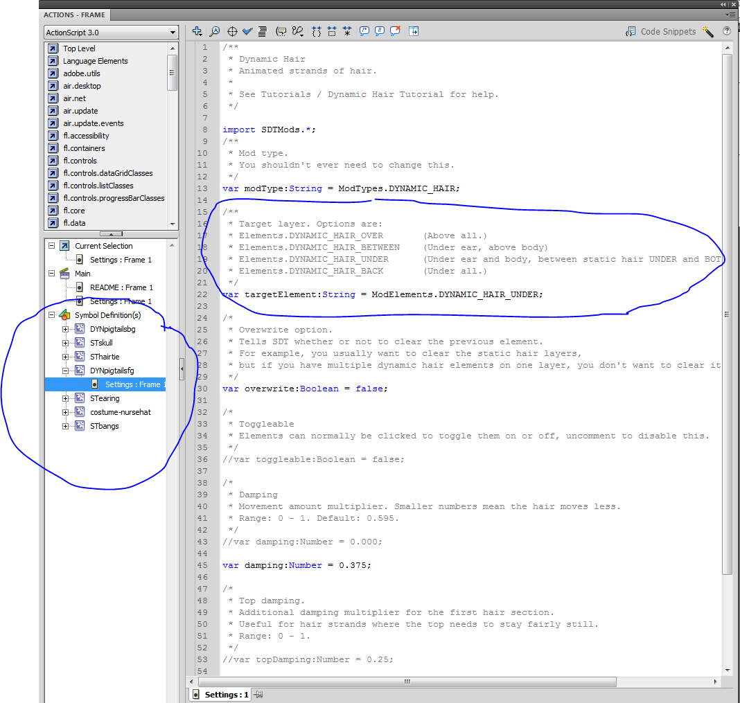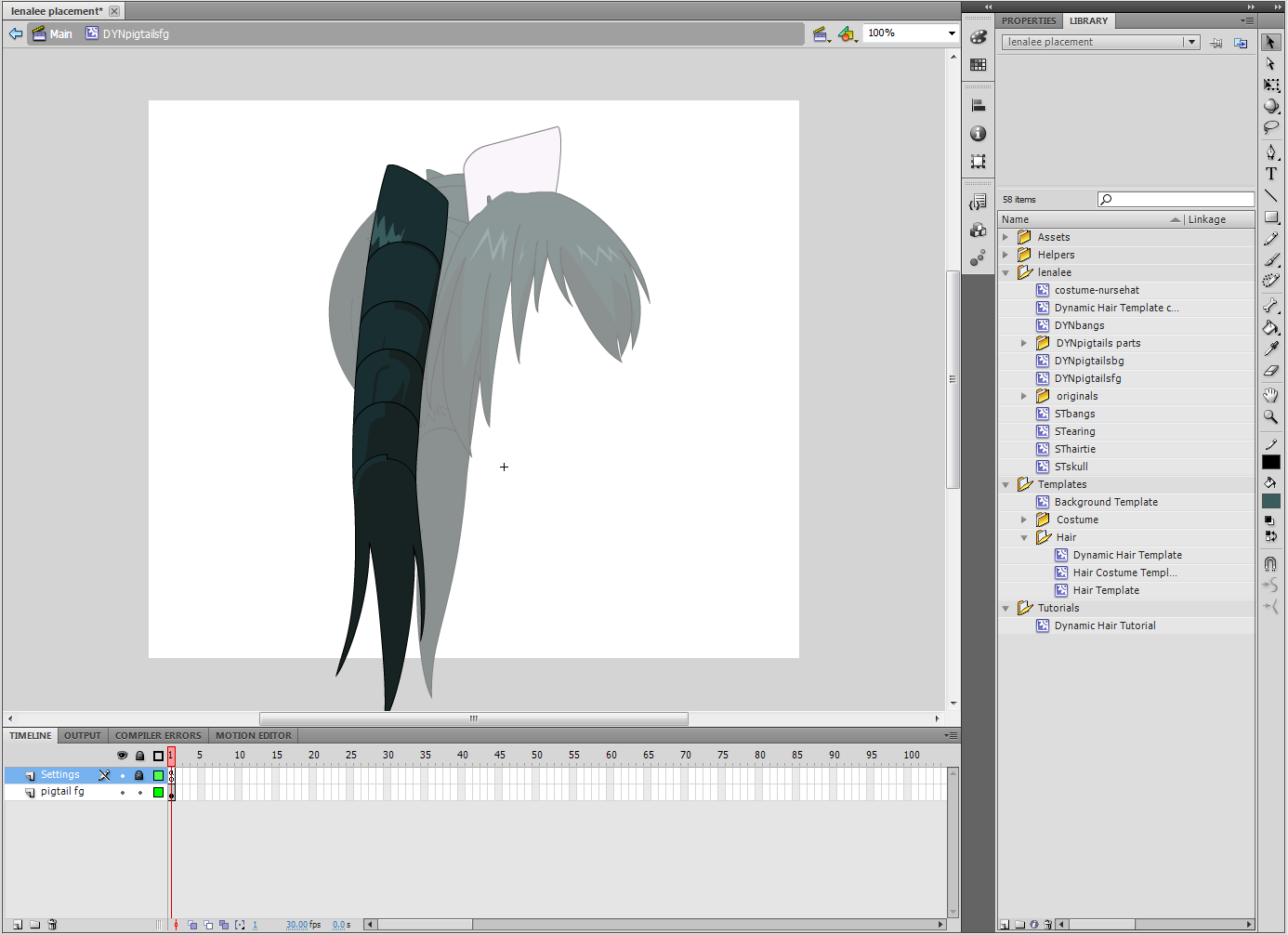 F*** that s***, dynamic importing is a pain in the ass and I don't have time for it right now. Also, I possess no artistic skill to redraw some of your work. There is a tutorial for dynamic importing inside of the SDTModding.fla, follow that and you should be fine. But always use Kona's templates because they have actionscript in them. Keep the Settings and Hair layers, the reference layer needs to be removed after you are done drawing the hair.