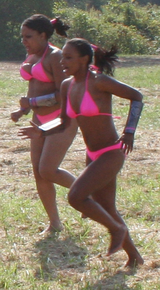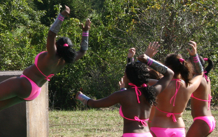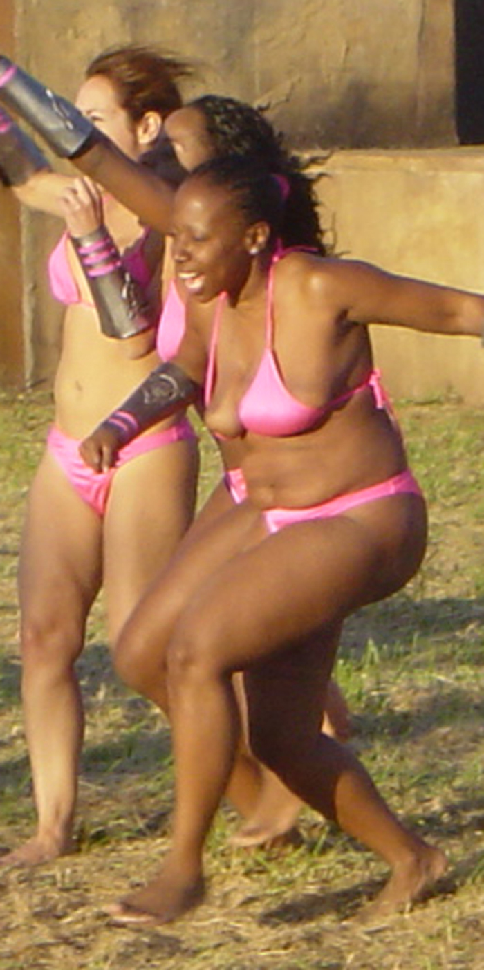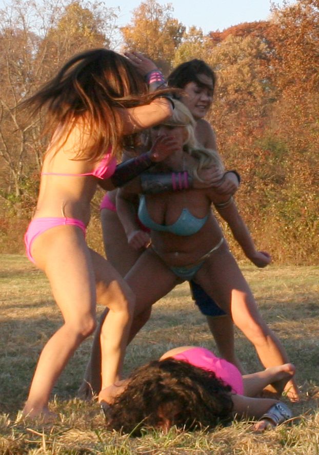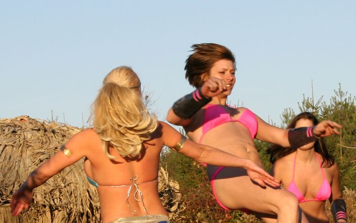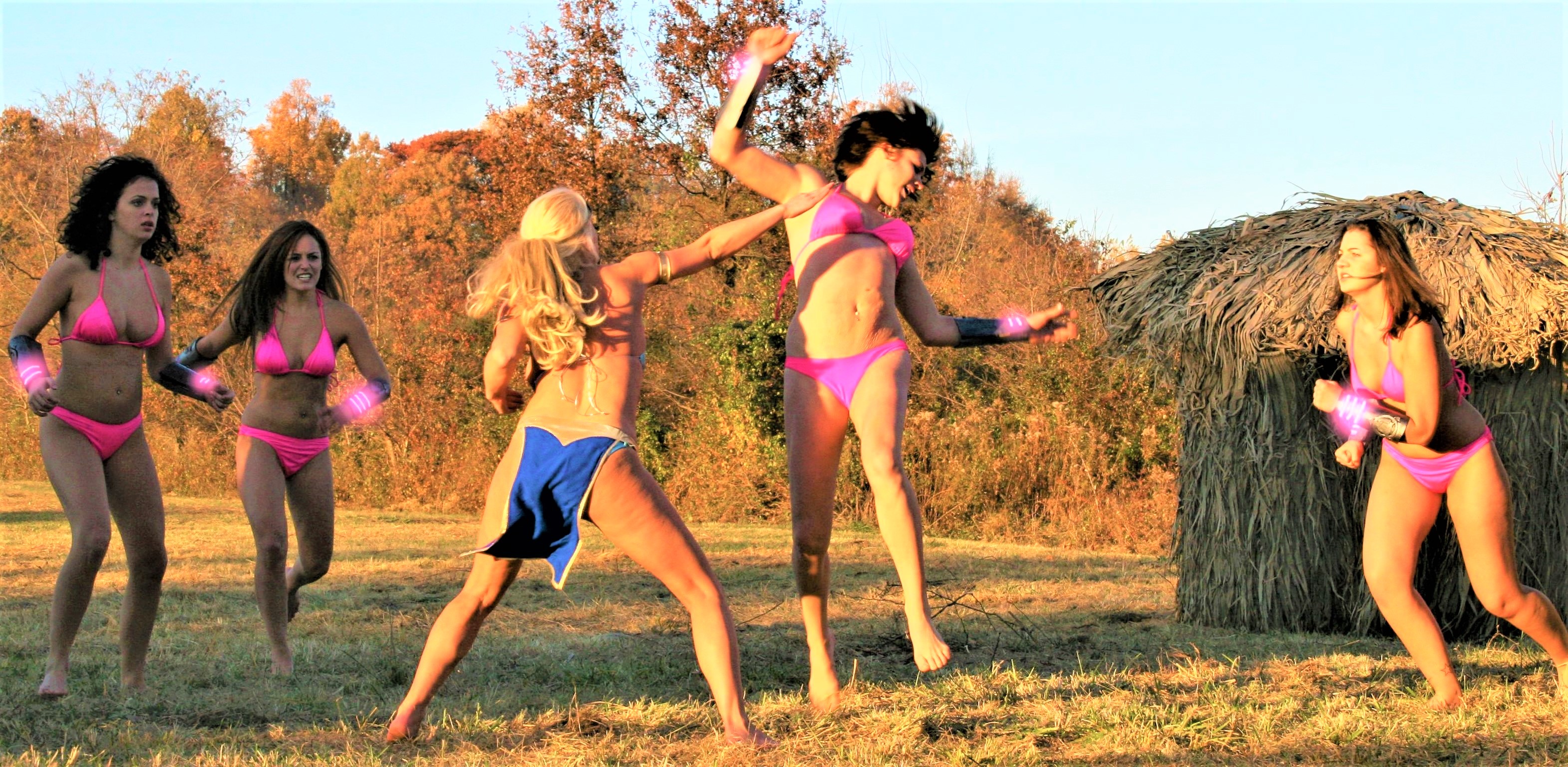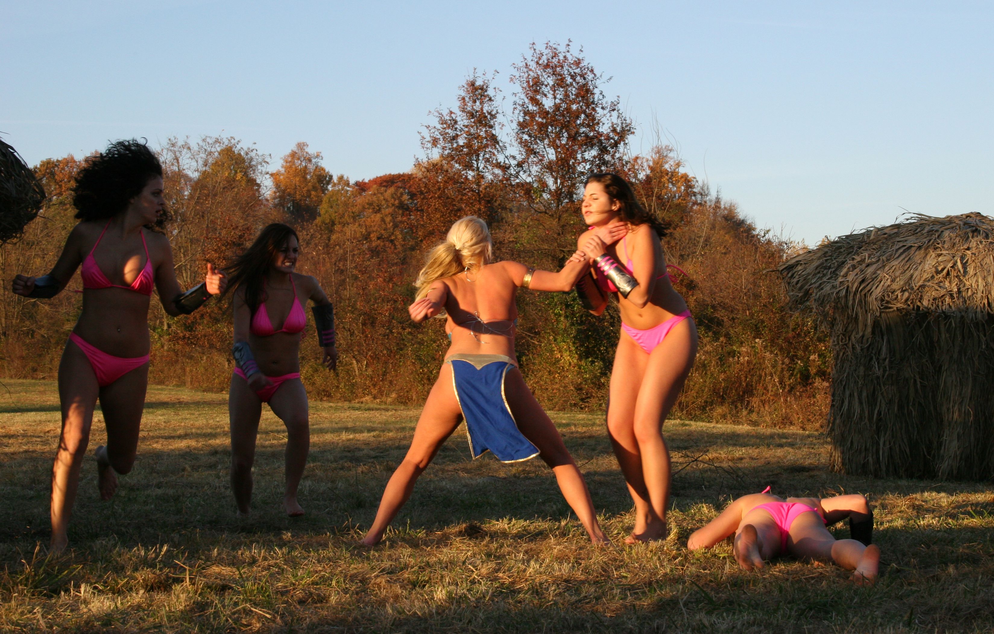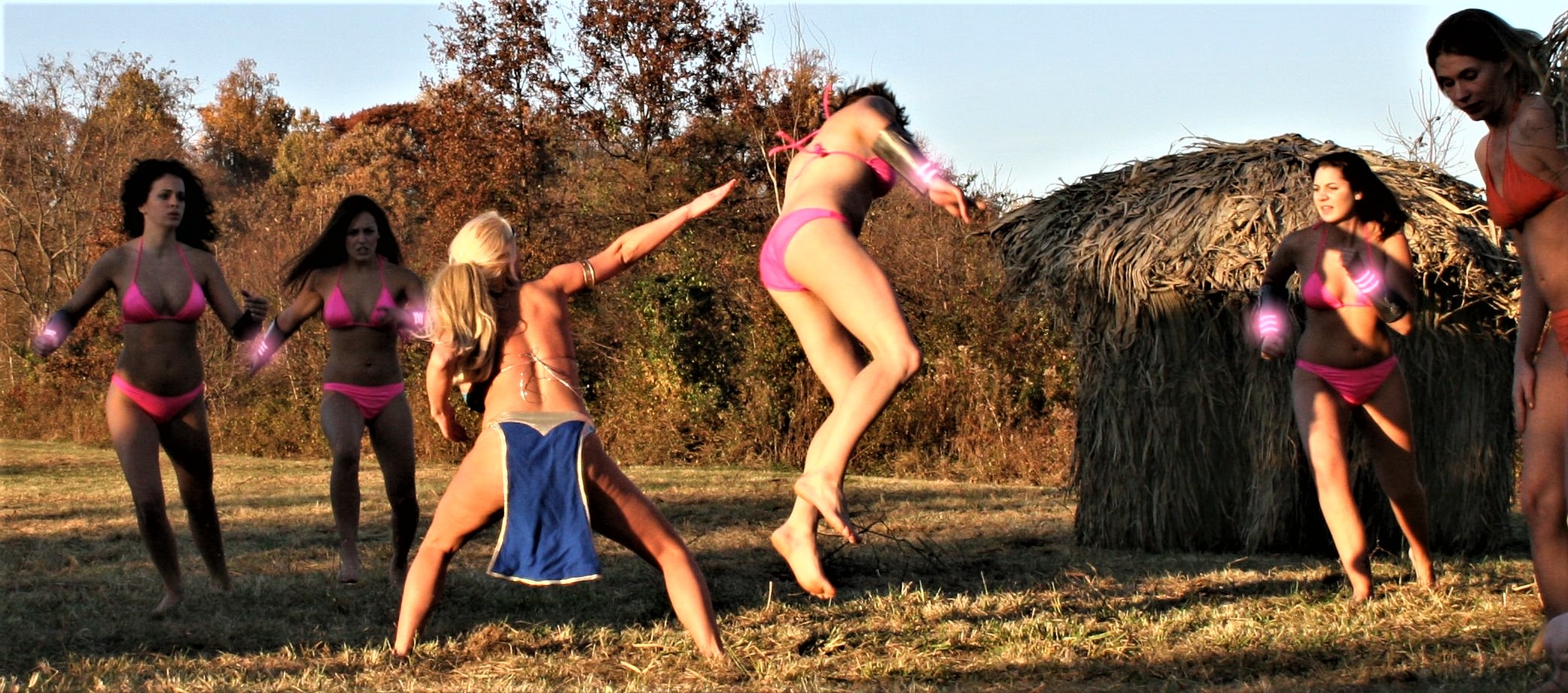 The heroine gets attacked by a large group of female goons at a hotel swimming pool at 1:17:40