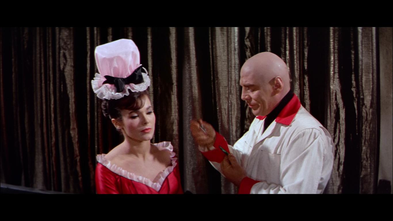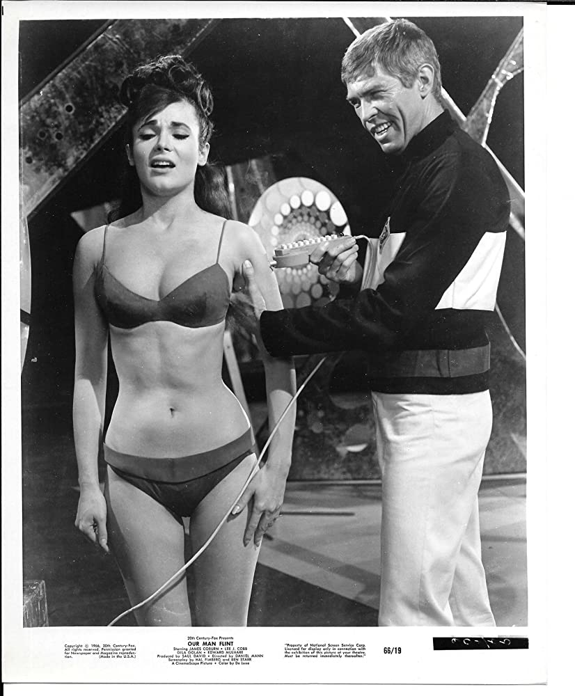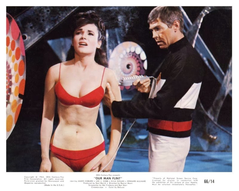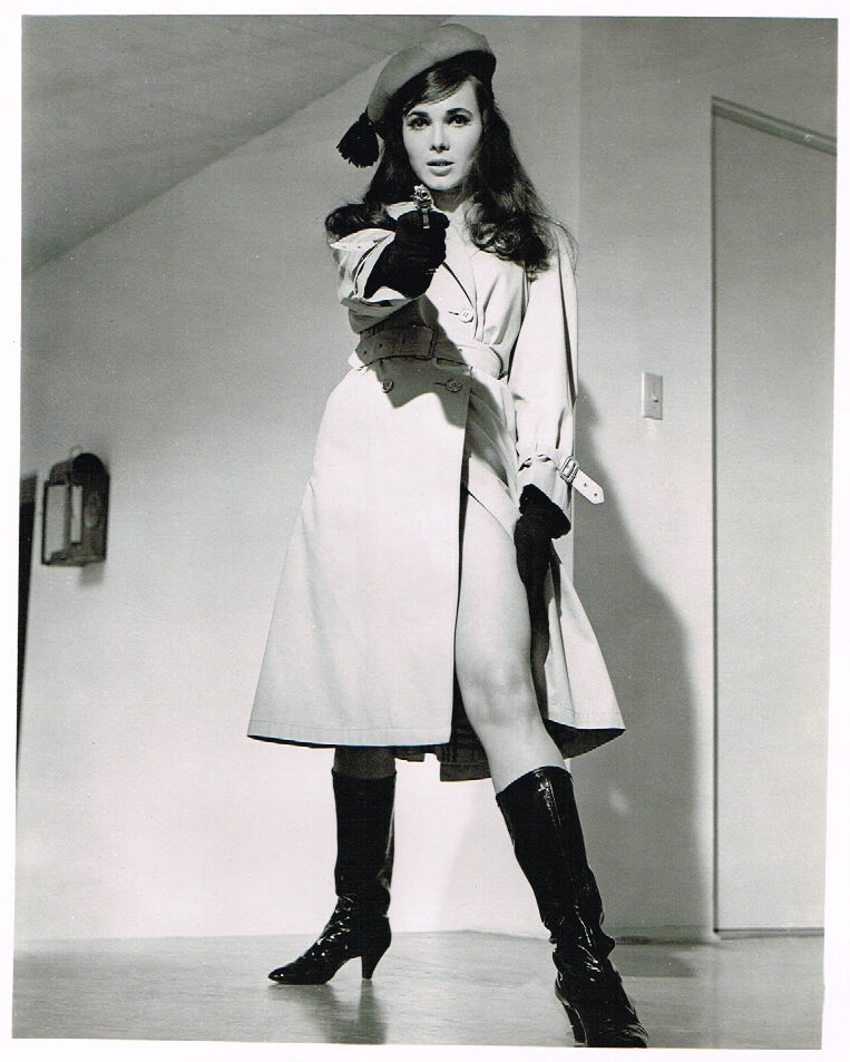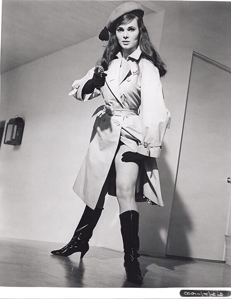 Sexy enemy spy lady Gila, from Our Man Flint. She tries to kill the Bond-like main hero for most of the movie, but when she gets demoted to "pleasure unit" for her failure, ultimately helps him escape and joins his harem. This gal has an epic hourglass figure and makes that trenchcoat work too!