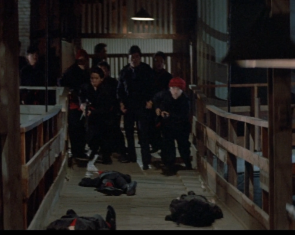 Earlier in this thread, Minion, AmazonShark, and I discussed this fun movie, which had one zako moment worth noting. Four martial arts henchwomen dressed in loose fitting kung-fu uniforms are guarding a bunch of captives, including the love interest of the hero. In the process of freeing the captives, the heroes have a martial arts fight with the henchwomen, knocking out three of them and knocking one unlucky henchwoman off a bridge (though we don't know how high it is). We later catch a brief glimpse of the three unconscious henchwomen lying on the ground as the rest of the bad guys run across them to chase the good guys, ignoring the defeated zako.
