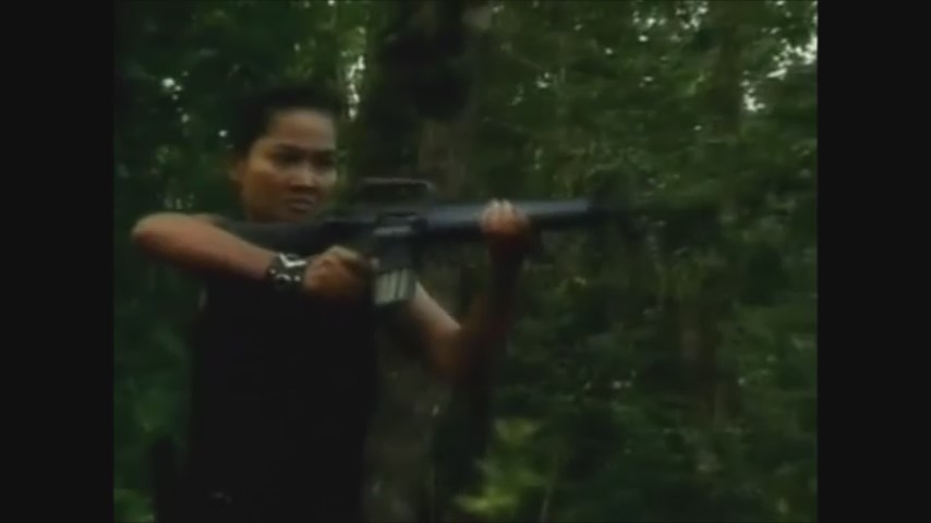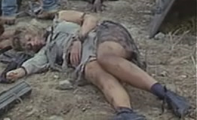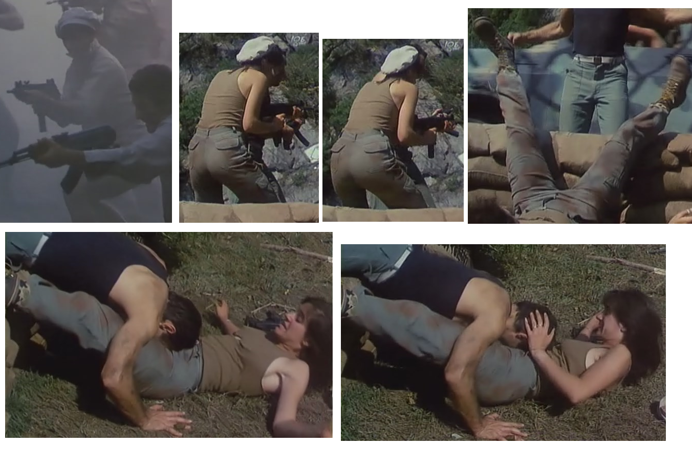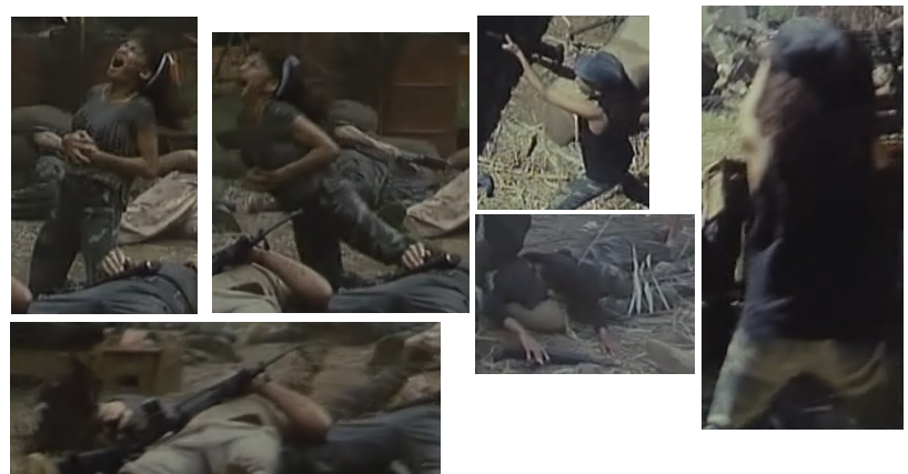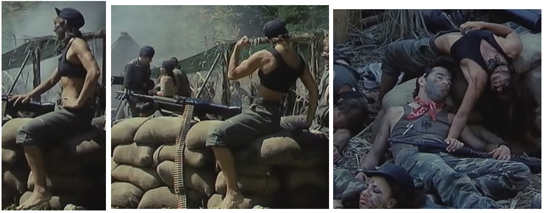 When the terrorist camp is attacked, we see that her toughness is indeed just an act because the male hero portrayed as the weakest of the bunch, whom she is guarding, wrestles her to the ground, gets the gun from her hands, and face slams her into the ground, leaving her motionless and facedown in the dirt.