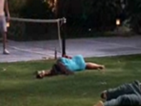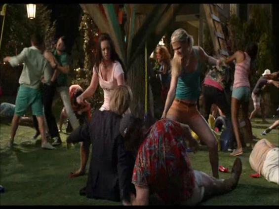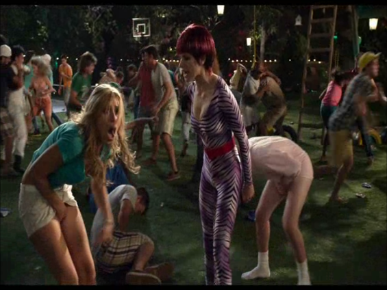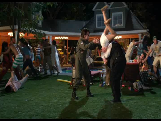 But anyway, an even fatter guy dressed as a smurf jumps from a treehouse on top of the two college chicks, squashing them unconscious and leaving them lying on top of the two stunned, happy fat dudes. Finally, one more sorority chick gets kicked in the crotch by a female partygoer in a skintight suit. You also occasionally see the college chicks fighting in the background (one hottie in green shorts shows up multiple times), and there is at least one time where you see a woman lying unconscious on the ground as the action continues (during Adam Sandler's fight and right before the chief baddie gets his comeuppance). However, you can't see her very clearly, and it's not obvious whether she is a sorority chick or a party goer, or what happened to her. I don't know if I missed any zako moments here. Perhaps someone else has better eyes than me?