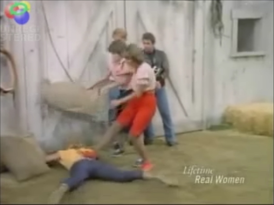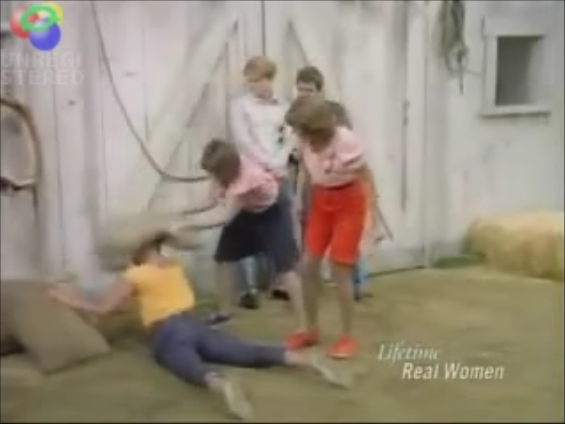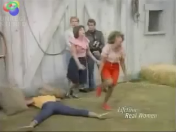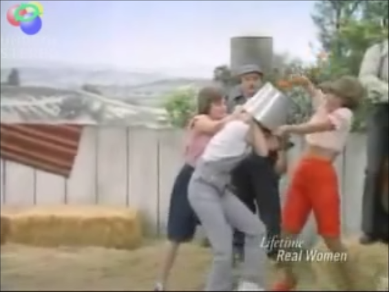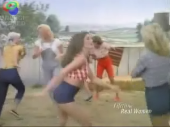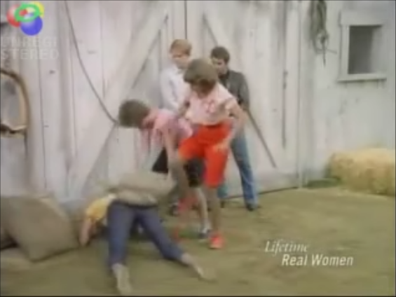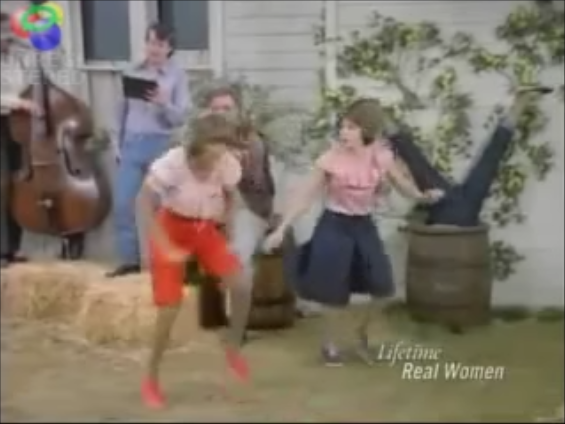 Anyway, in this episode, Laverne and Shirley have to save Fonzie and some other guy from being married to a farmer's six daughters by having a dance competition. They soon realize the farm girls mean to beat them up during the dance, but Laverne and Shirley turn the tables on them. The farm girls are quite attractive and two of them are wearing some great cut-off shorts and halter tops, with a few more wearing somewhat tight jeans. Although the violence is comical and not meant to be taken seriously, there are some moments I really like. One farm girl is thrown headfirst into a barrel, and you see her legs sticking out of it. Another farm girl has a bucket put on her head while one of the heroines smacks her, and is later thrown headfirst into an open window. You see her legs hanging motionless out of the window as the heroines continue their dance/fight.