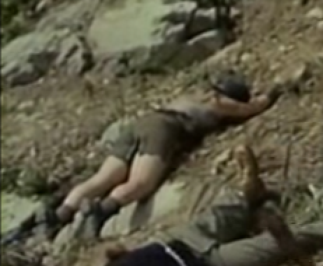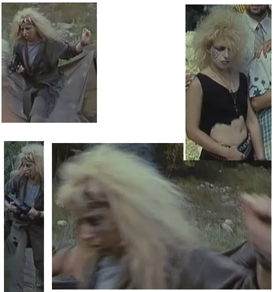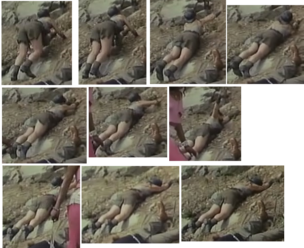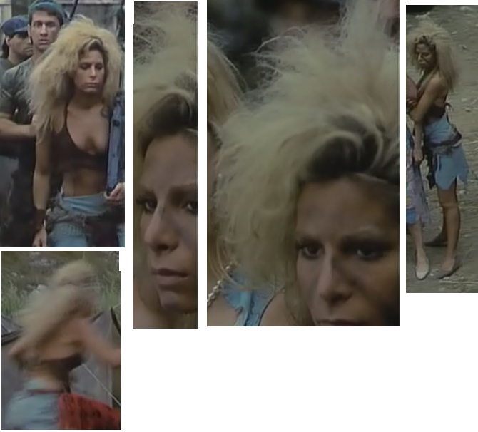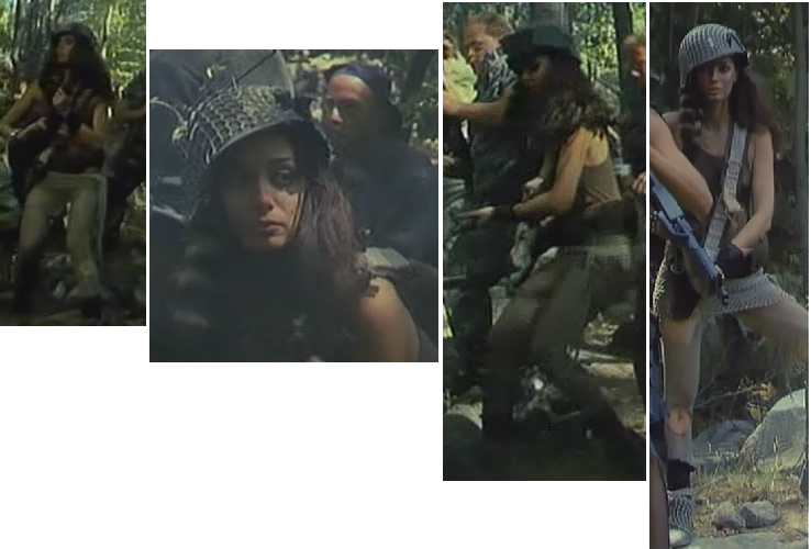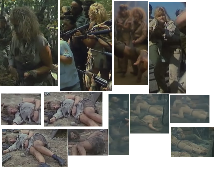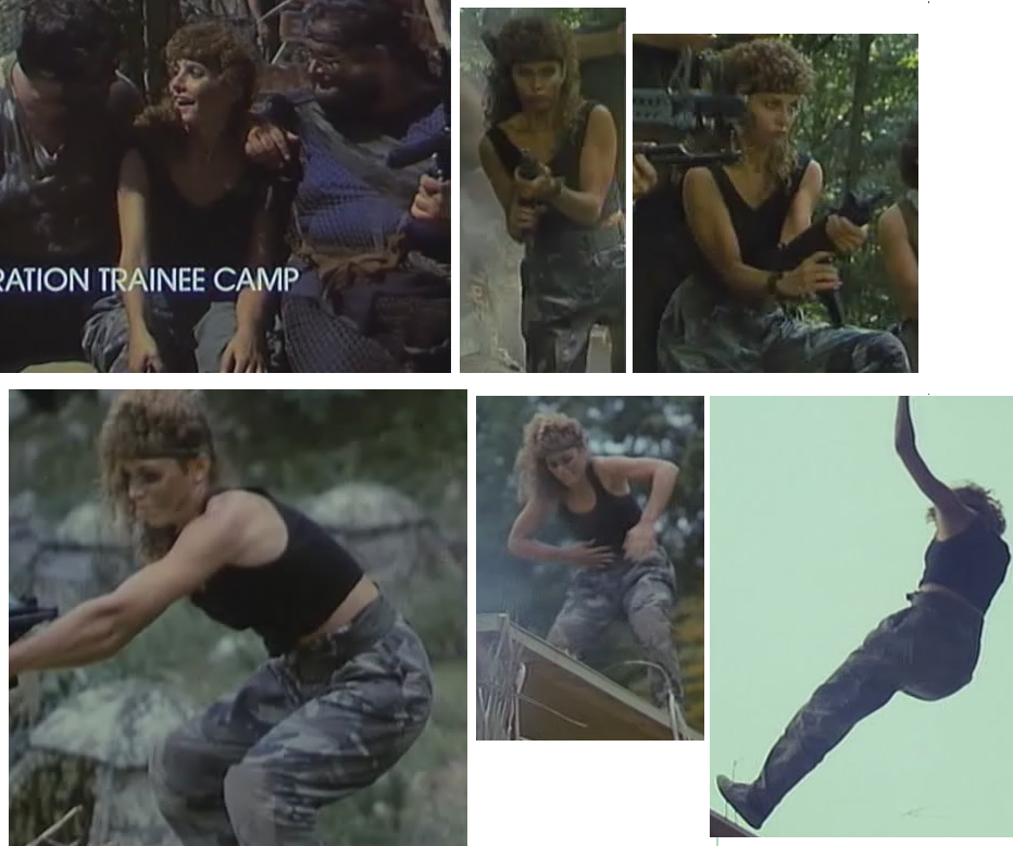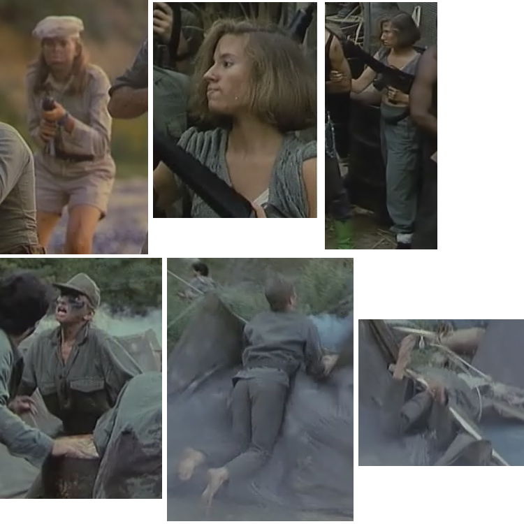 16. Miscellaneous 1&2: These are zako I could never really place, and I could never find more than one quick scene with them. The one at the bottom in the first pic (wearing loose uniform and cap, falling on tent) I only assume to be a female baddie because there is a female scream when she is shot and she looks more delicate than the male baddies. In the second pic...I'm sure the blonde at the top left is one of the previous zako but I'm not sure which. I also think her actress played a dead victim of the initial plane crash. The girl lying on the sandbags in the top right of the second pic could be Shorts Girl or Torn Shorts Girl (next on this list) but I'm not sure. Anyone got an idea? Last but not least, we have some various female legs shown during the forest scene, but I'm not sure which zako they belong to.