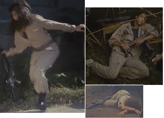 13. Shorts Girl: I'm not positive I matched these up correctly (we never see this zako very clearly), but here goes. We first see this zako wearing a black halter top, tan short shorts, and white shoes. She is only on the screen for a moment as she is backhanded by one of the heroes and tumbles out of the screen with a pitiful grunt/groan. That's her only action scene, but I'm pretty sure we see her for a quick moment later on, when the heroes are planting explosives to blow up the terrorist camp. She is lying on her side among the other dead baddies, now wearing a vest, but the same tan shorts. We only see her face for a split-second as the heroes set an ammo box right in front of it as part of their explosives set up, but we can see her very nice legs in those shorts for a while longer. The scene makes me wonder...if this zako was merely knocked out by the earlier punch, did our valiant heroes drag this terrorist chick over to the pile and set up some explosives right next to her to make sure she was finished off in the explosion?