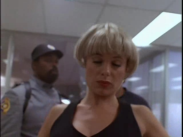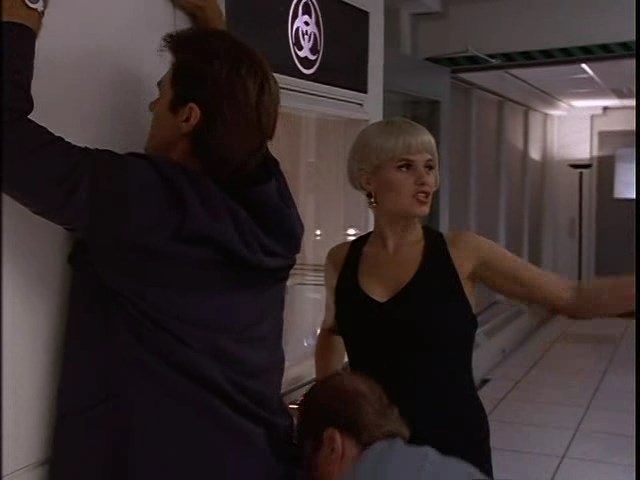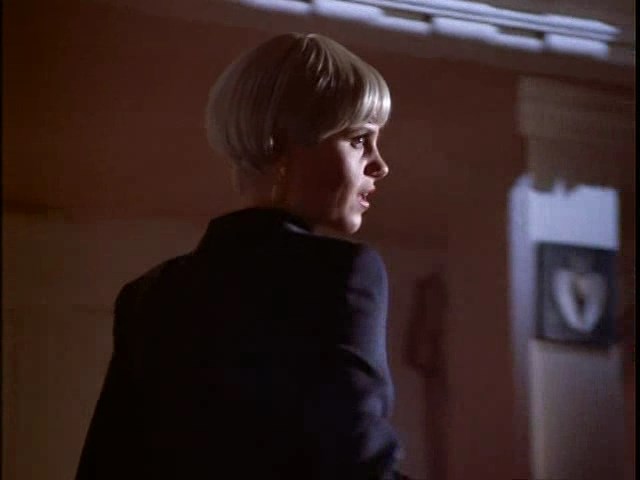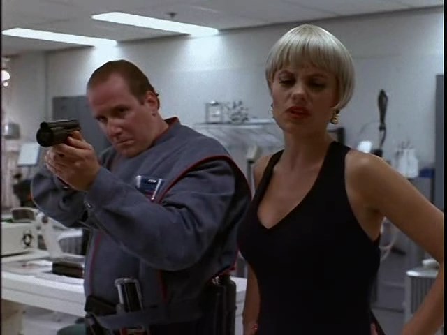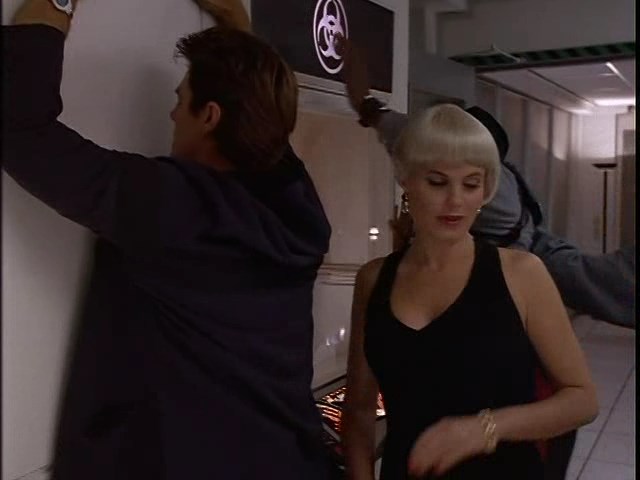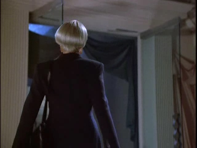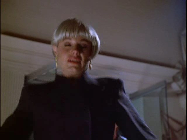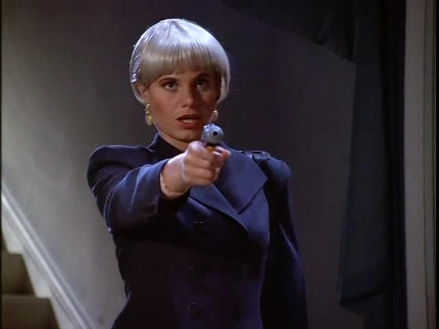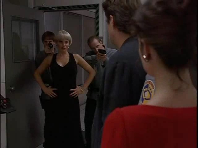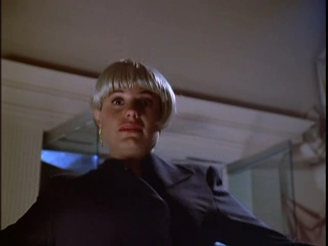 Sexy blonde assassin lady from TekWar, S2E01. She killed a sellout of the company (off-screen) and then eliminates the prostitute he was selling information to by first shooting her with a tranq dart, then putting a Tek device (sort of a virtual reality combined with chemicals drug) on her and setting it so she overdoses. During this, the whore visually sees the assassin girl getting shot in the back - but that does not happen in real life.