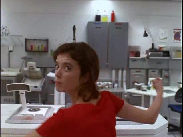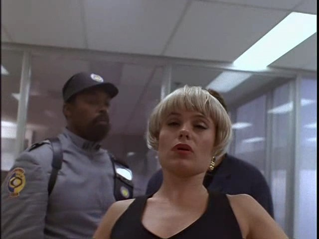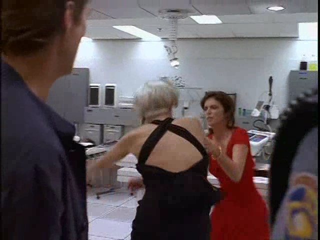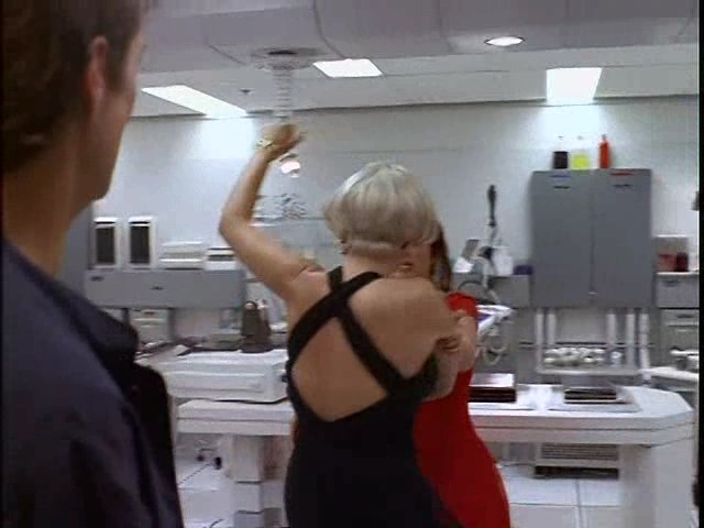 Her boss tells her to keep an eye on the hero, so she tries flirting with him, but he points out how many things at the party are fake and starts a fight to get arrested so he can infiltrate the lab. He later sees the henchwoman test the new sonic applied drug on a young guy. Later though, she tracks her down with guards and holds them at gunpoint. When confronted, she reveals to the scientist girl how she killed the leaker scientist and the prostitute, bragging about her skills and saying "Nobody is perfect" when reminded they still found out. The partner guy manages to distract her with a detector device, pretending it is a bomb. That starts a brawl, and a most epic catfight between the scientist lady and the assassin, which she loses as she knocks her out with a punch to the face - lucky for her the heroes are gallant and catch her as she falls, gently lowering her to the floor. We do not see her again, but since the heroes cuffed the henchmen and took them out of the lab before it exploded, she too was likely arrested.