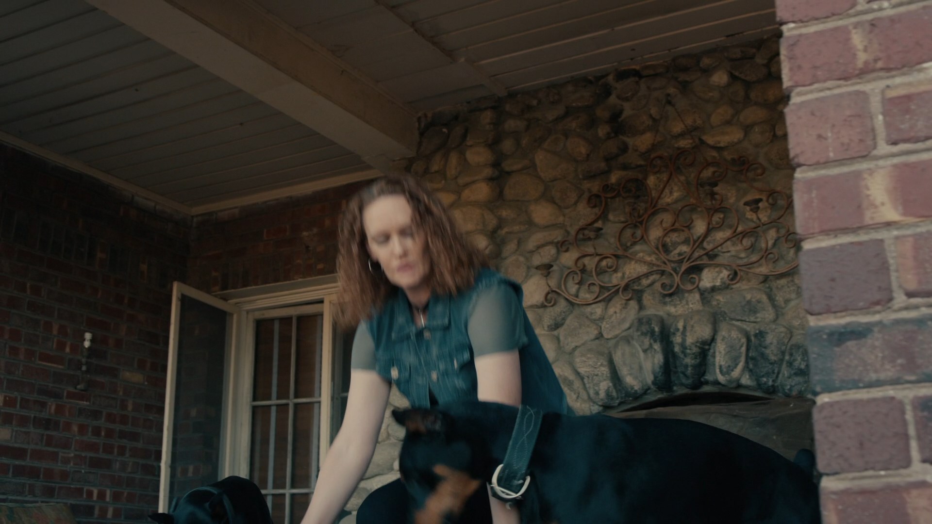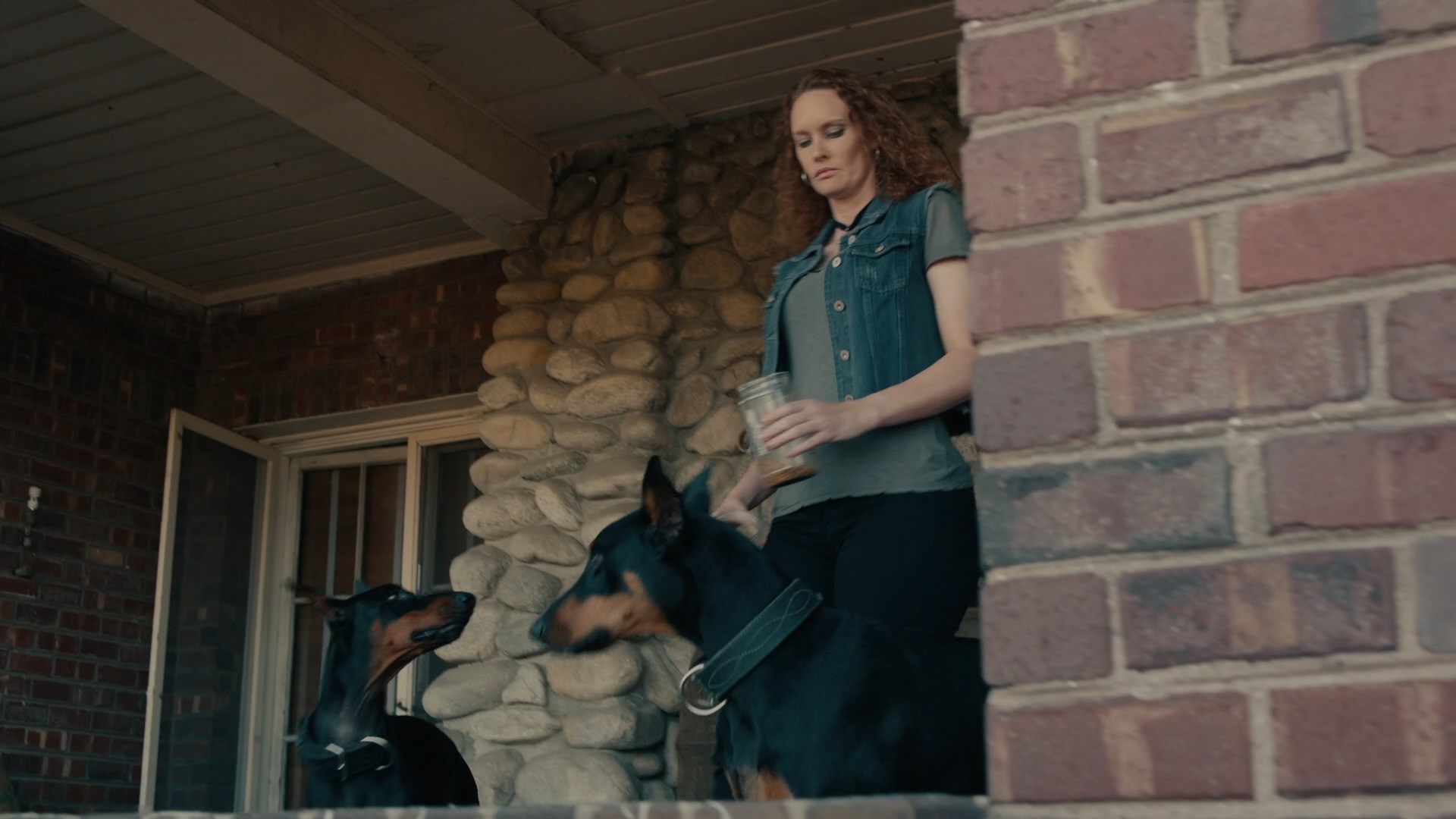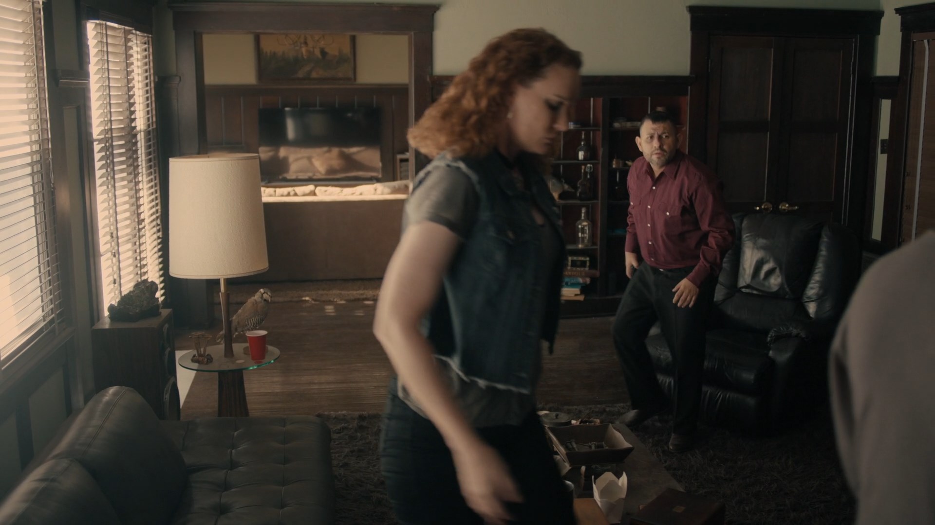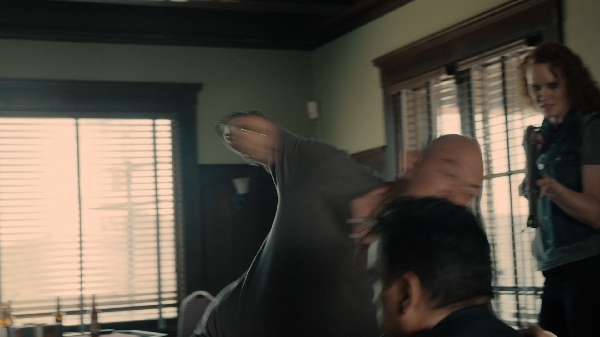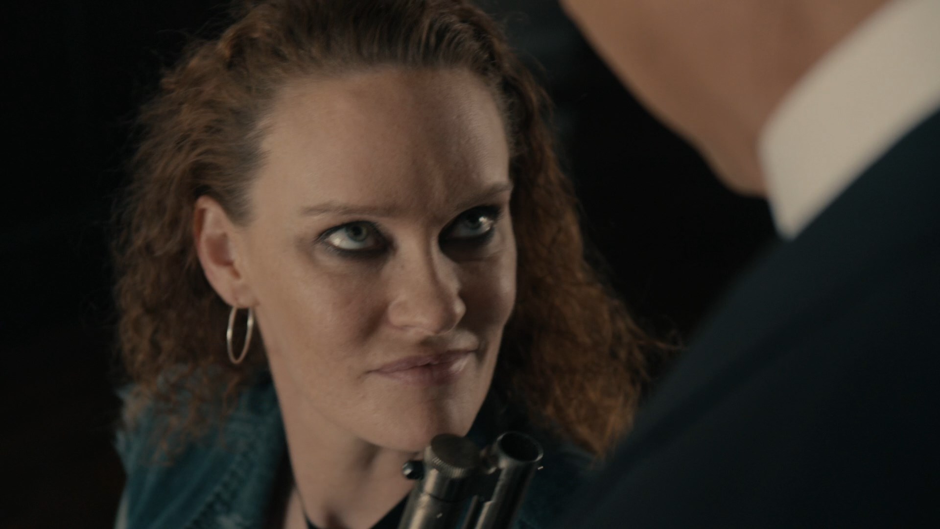 As far as I know, she never gets named. She works for a human trafficker (implied she also sleeps with him) and is left at his home to guard a locked room the first time we see her. In her next appearance, her boss is warned that Sugar is coming and the henchgal puts a bag over her head and pretends to be the kidnapped victim, only to pull a shotgun on him. After they are done kicking him around, they are about to execute him but he turns the tables on them. She gets shot in the belly, but is far from out of the fight, and ambushes Sugar from behind, stabbing him in the stomach with a large knife. She tries to push the knife in deeper to finish him off, but he manages to turn his hand back enough to shoot her in the gut, and then puts a round between her boobs, making her tumble backwards and crash into the wall. He then puts one between her eyes just to make sure she stays down. You can see her body on the floor in later shots too.