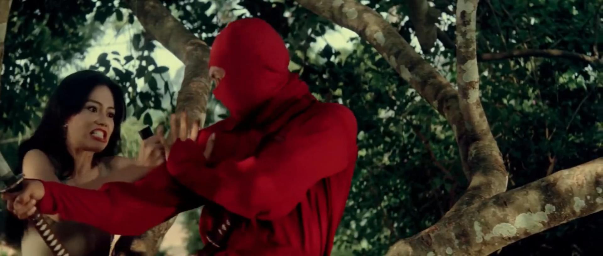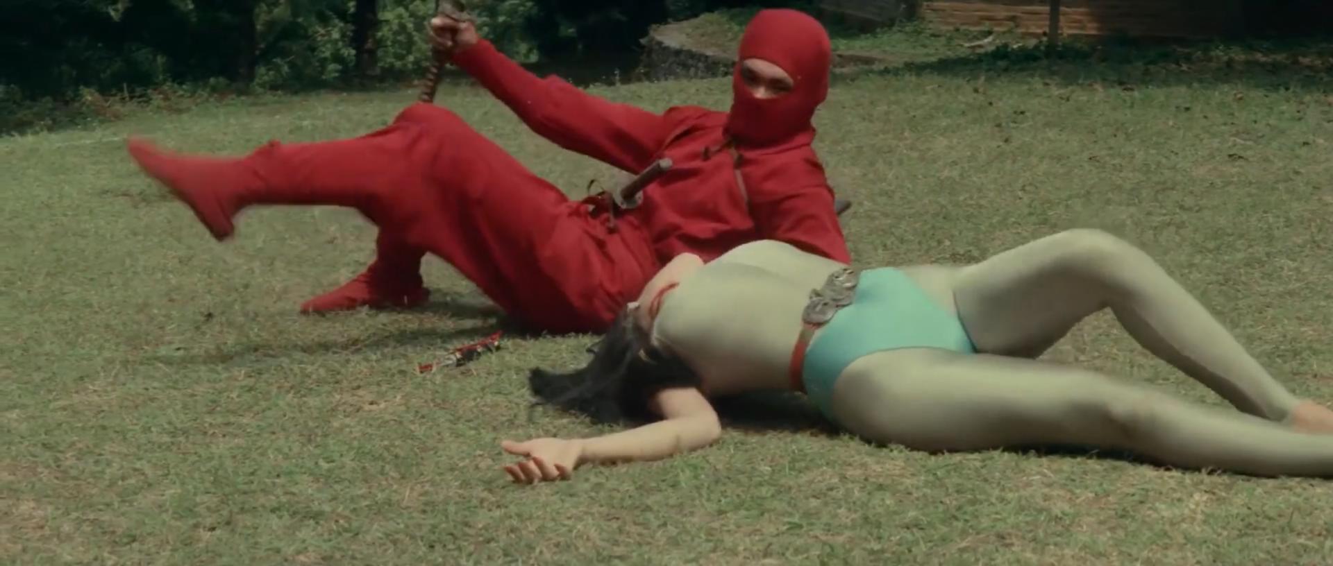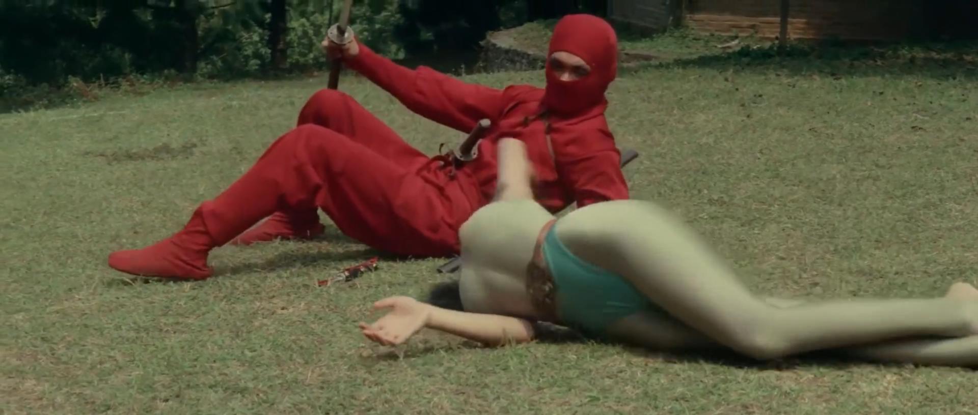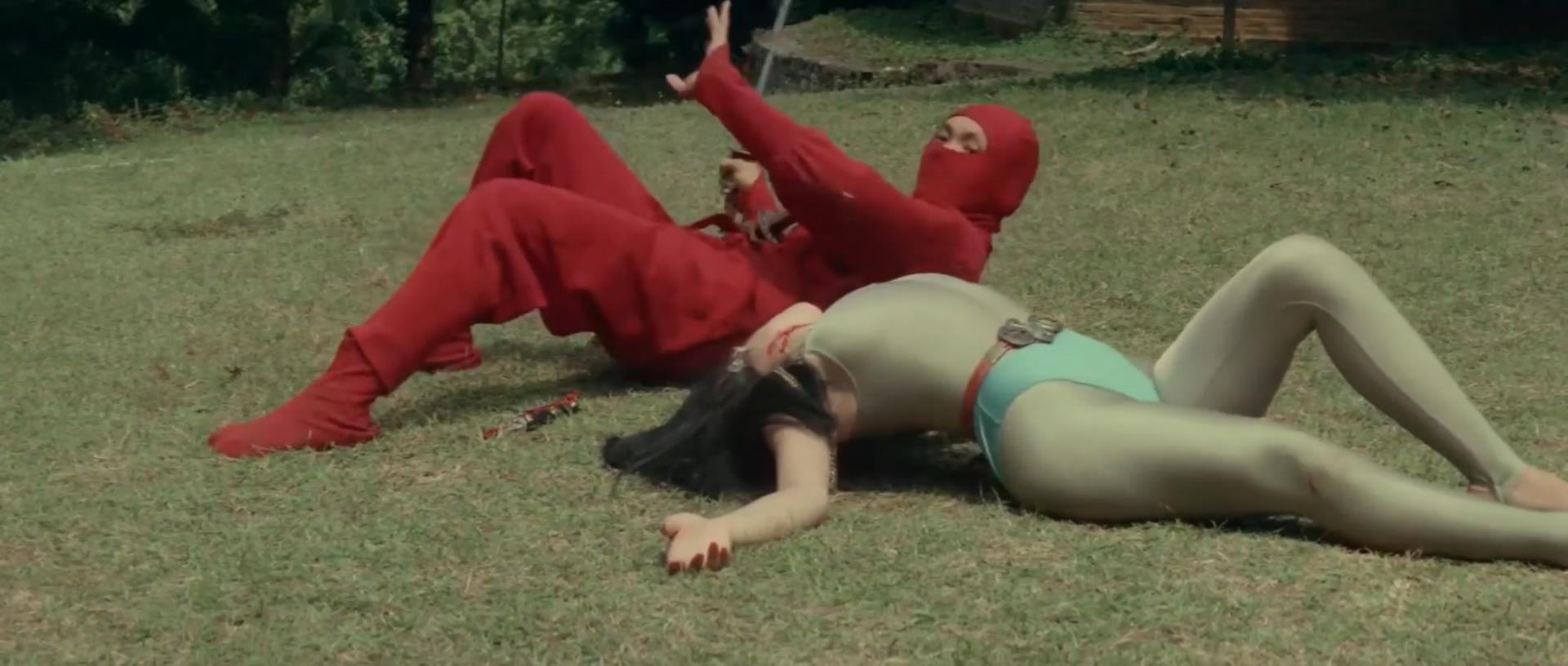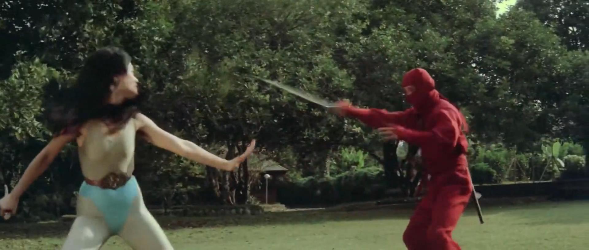 In this one, the outfits are pretty bad too. Just full body red leotards with those ridiculous Elvis-style long straps on the arms of the clothing, white boots and black masks. Not super sexy nor revealing.