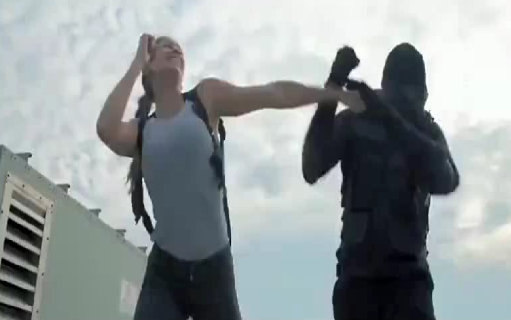 BUT, there is an evil blonde henchwoman who is in the very beginning of the film, undercover, in a bikini, spying on the hero.