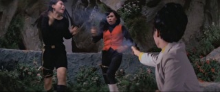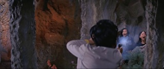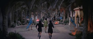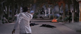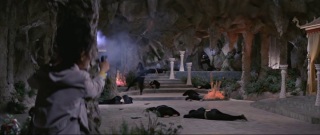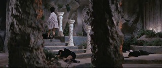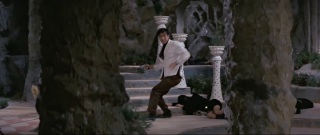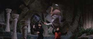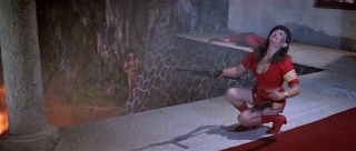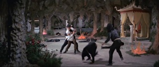Buck runs and leaps off the steps and lands in front of the two startled guards. The Zako are shocked but try to draw their laser pistols. Before they can draw and aim at Buck, the Prime Minister’s daughter garbs each of them by the neck. She seems to do some kind of Vulcan Neck Pinch to them as both girls begin to sink to the floor apparently being knocked out by whatever she is doing to them.